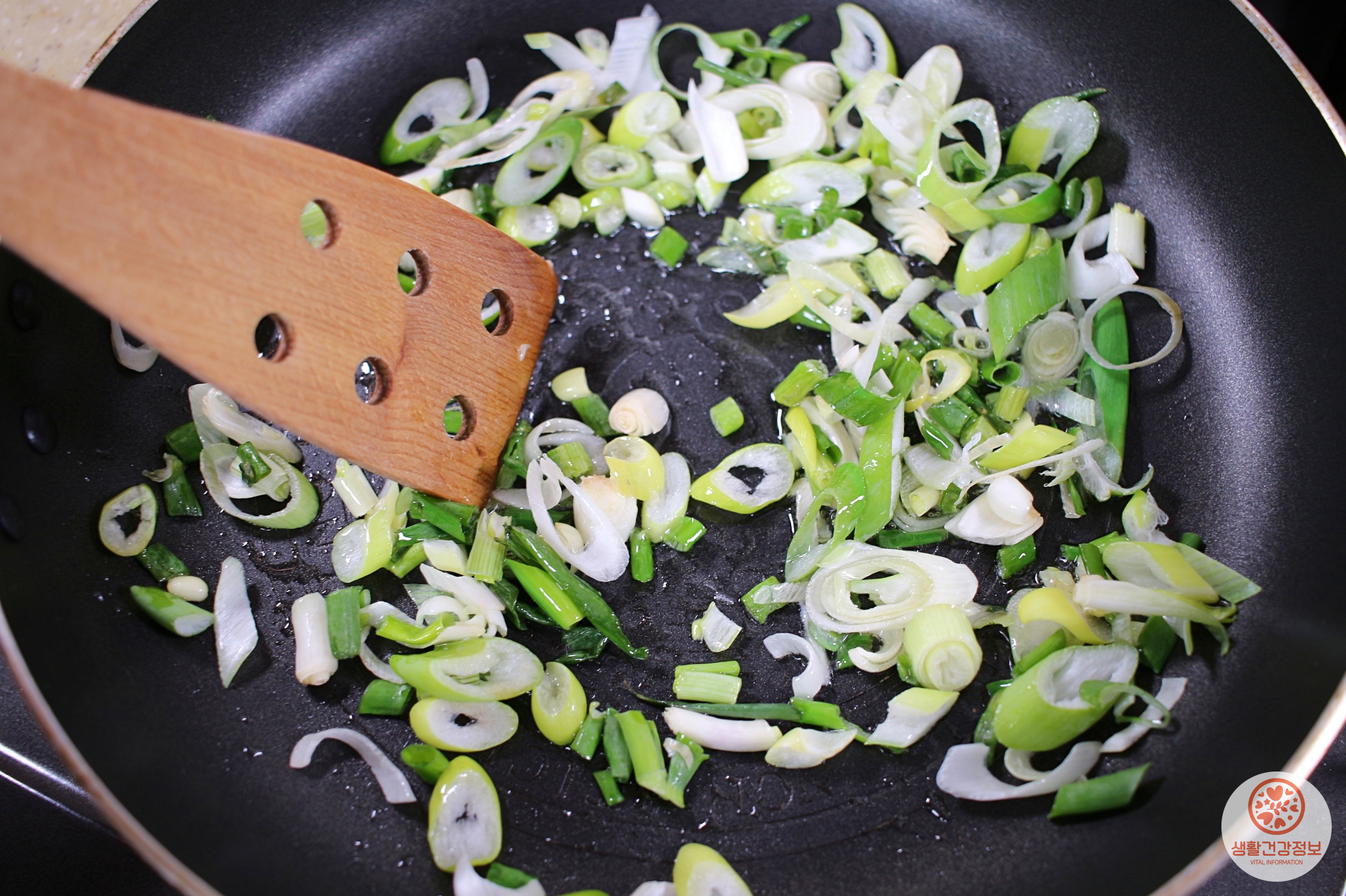기름 2큰술에 대파 한줌 넣어서 볶아주세요.