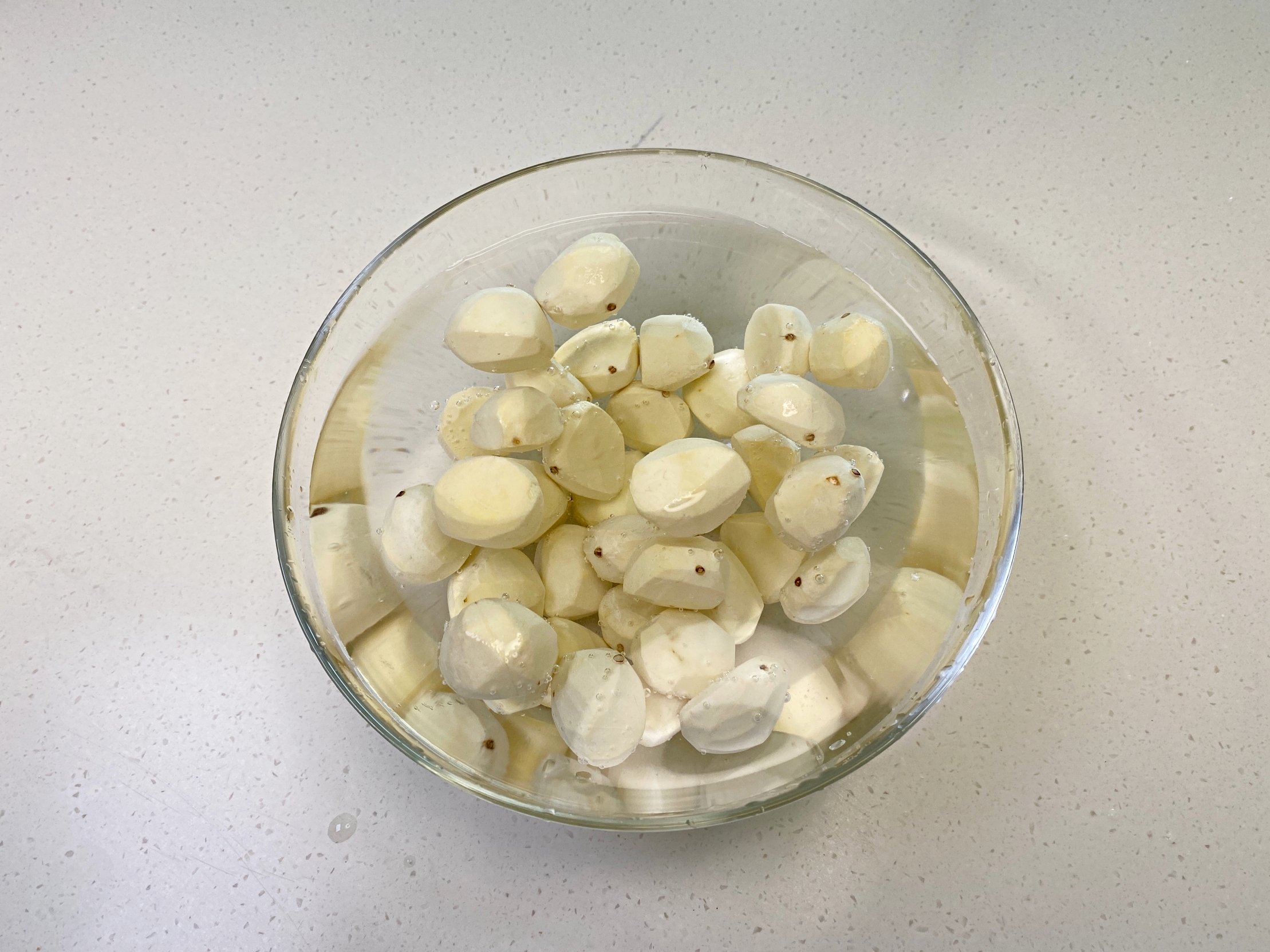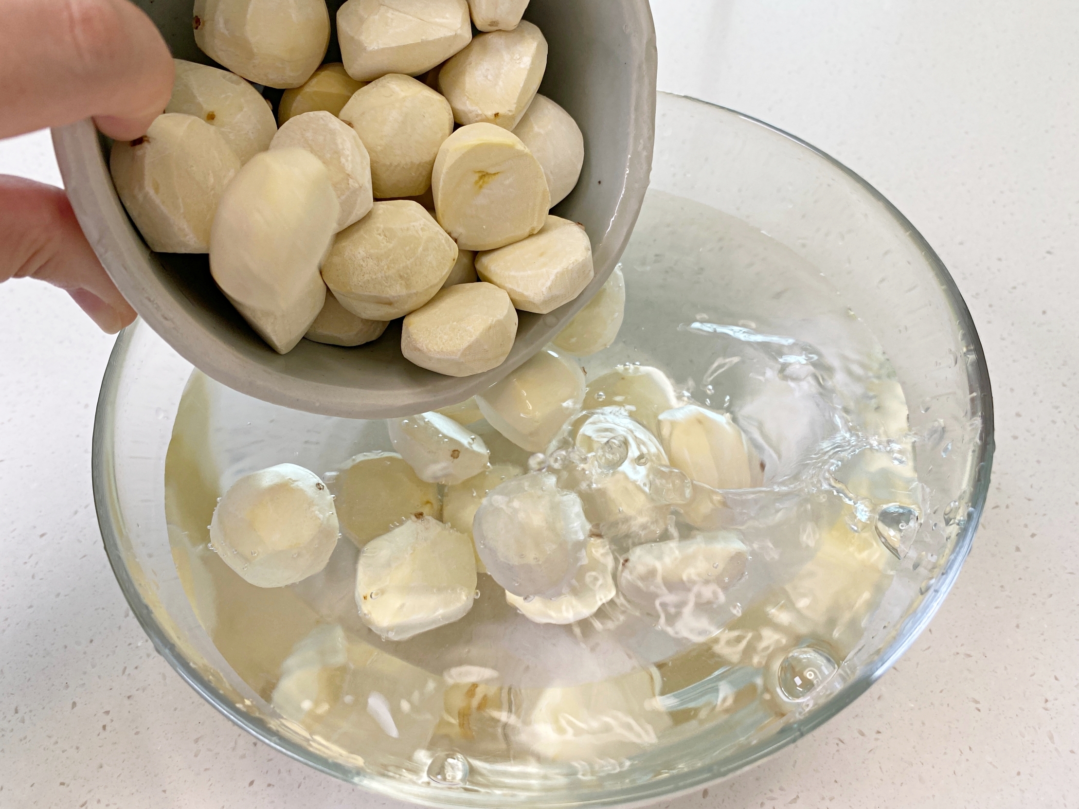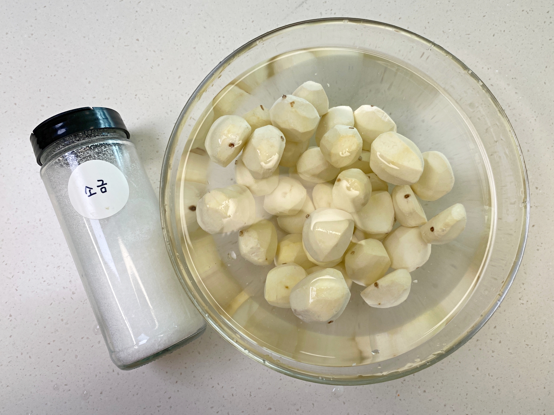 여기에 껍질 깐 밤을 퐁당- 담가요.