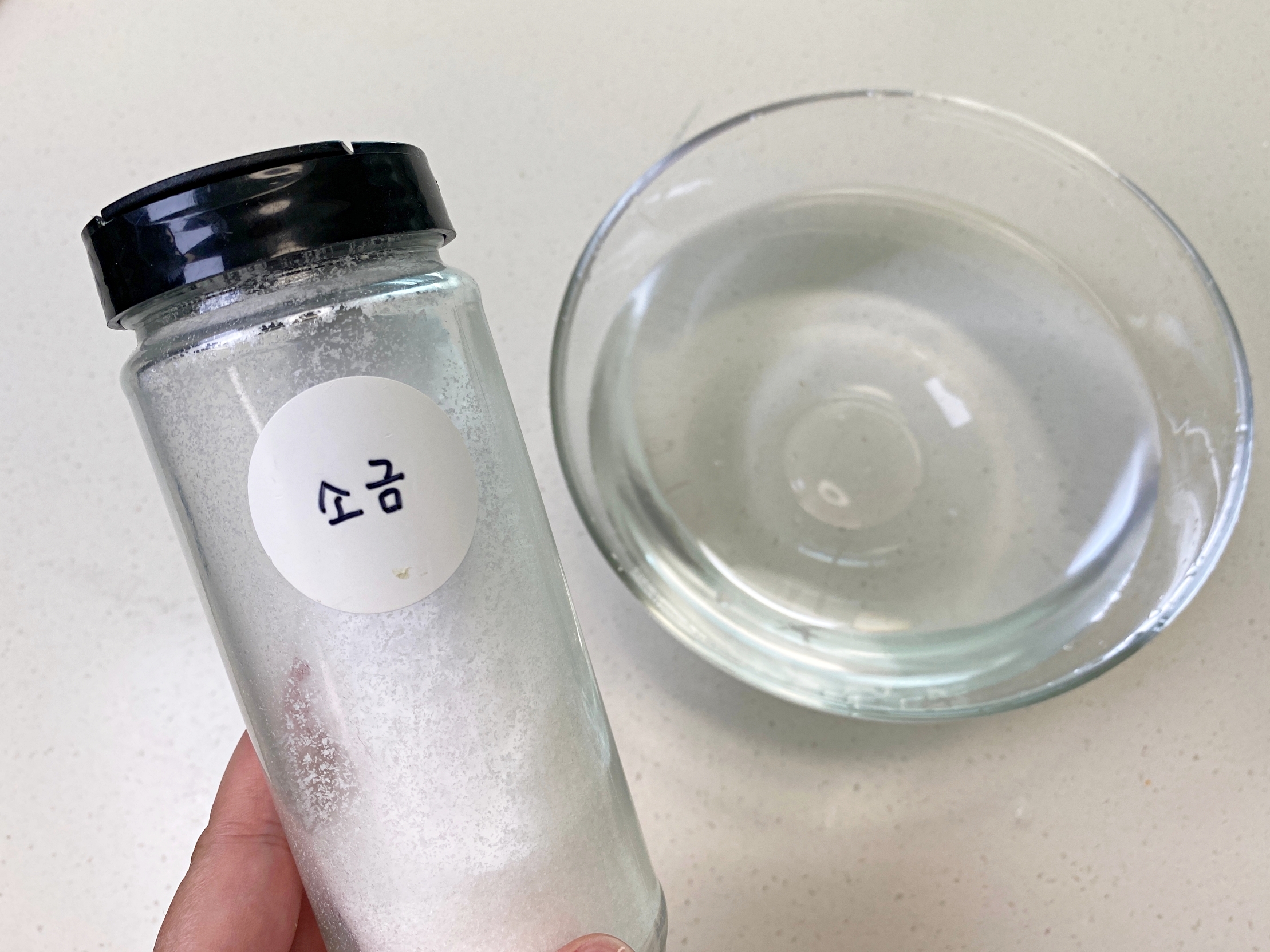 맹물 1리터에 소금 한큰술을 넣어 충분히 녹여주세요.