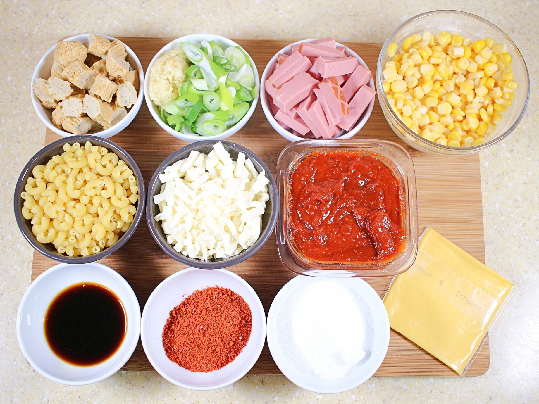 재료는 마카로니, 어묵, 다진마늘, 대파, 햄, 캔옥수수,