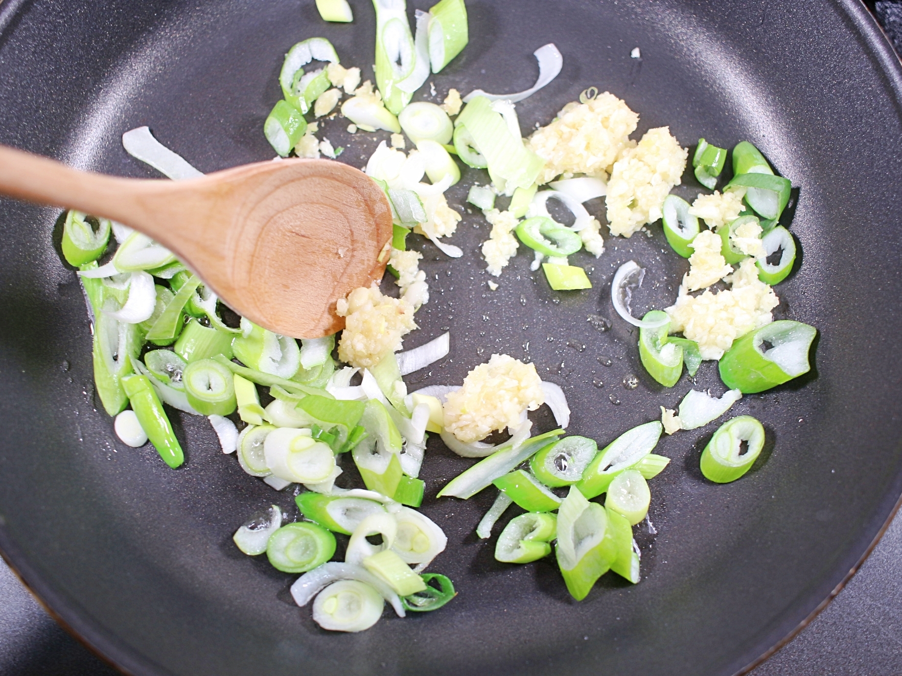 송송 썬 대파 한줌을 볶아 향긋한 파기름을 만들어주세요.