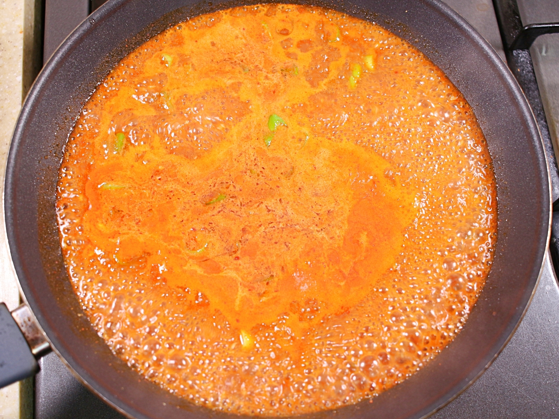 파기름이 완성되면 준비한 양념장을 한꺼번에 붓고 끓여요.