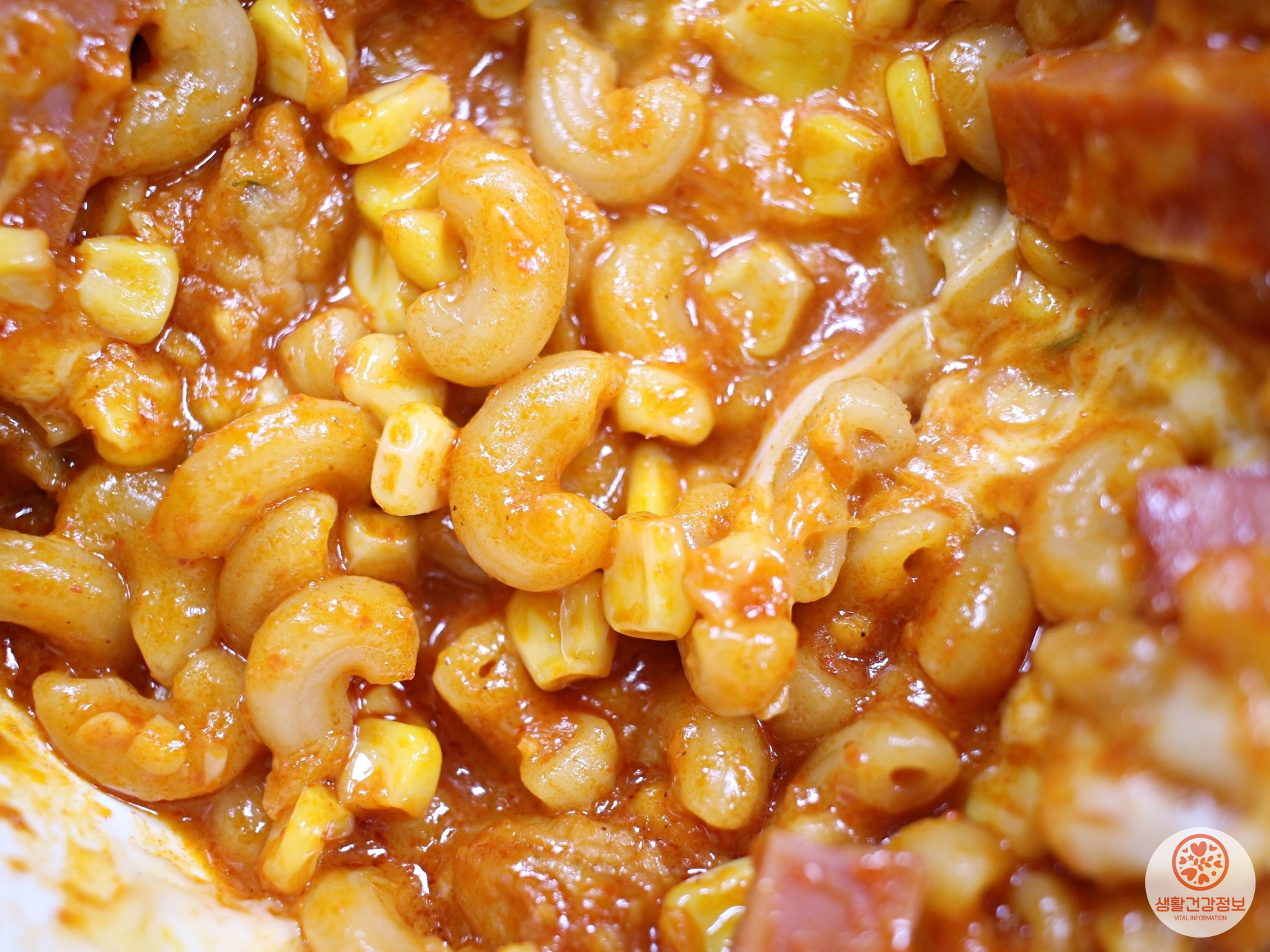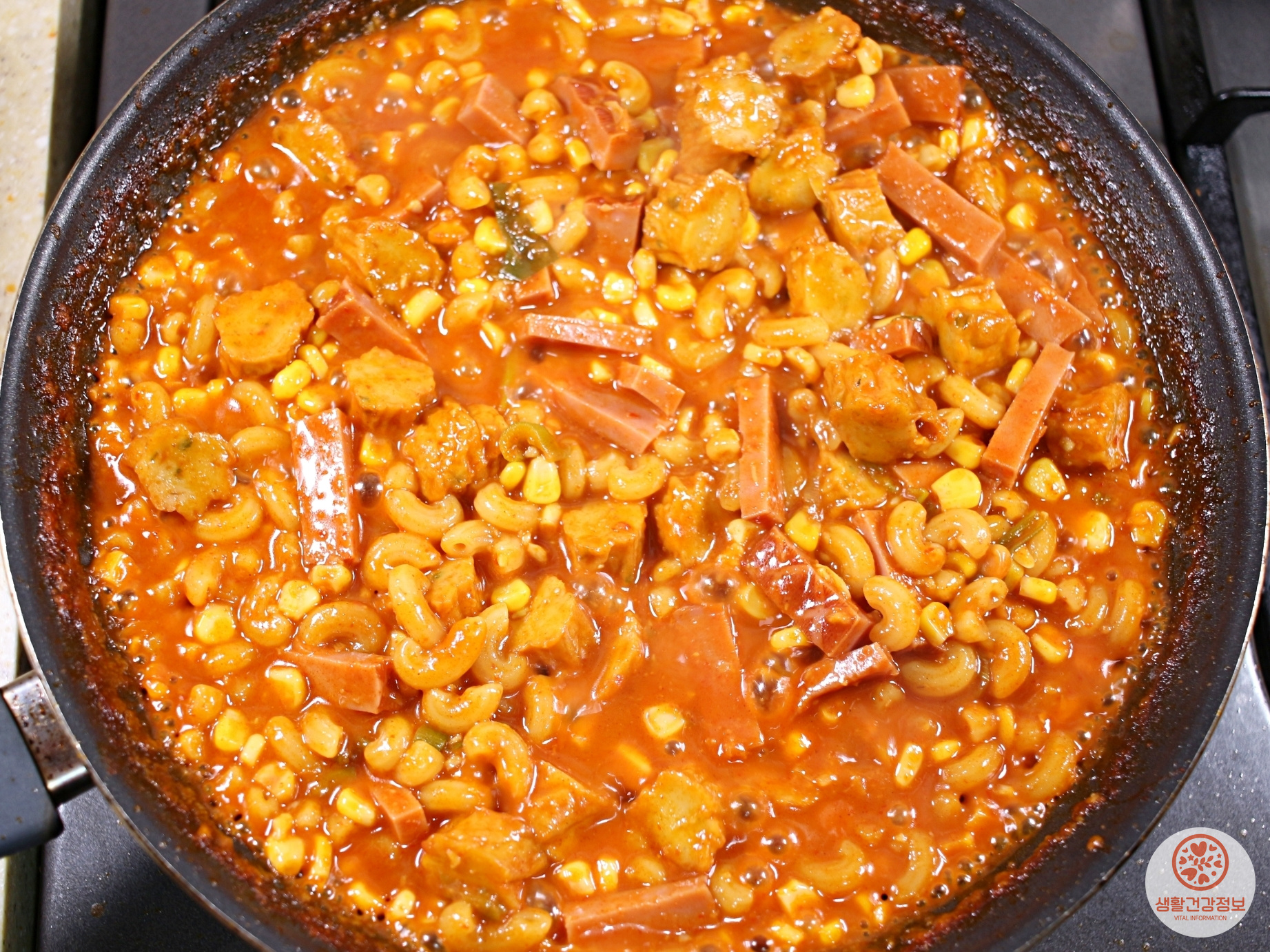 재료는 마카로니, 어묵, 다진마늘, 대파, 햄, 캔옥수수,