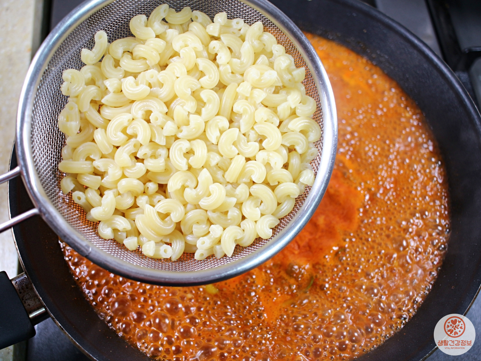 양념장이 끓으면 삶아놓은 마카로니를 넣고요.