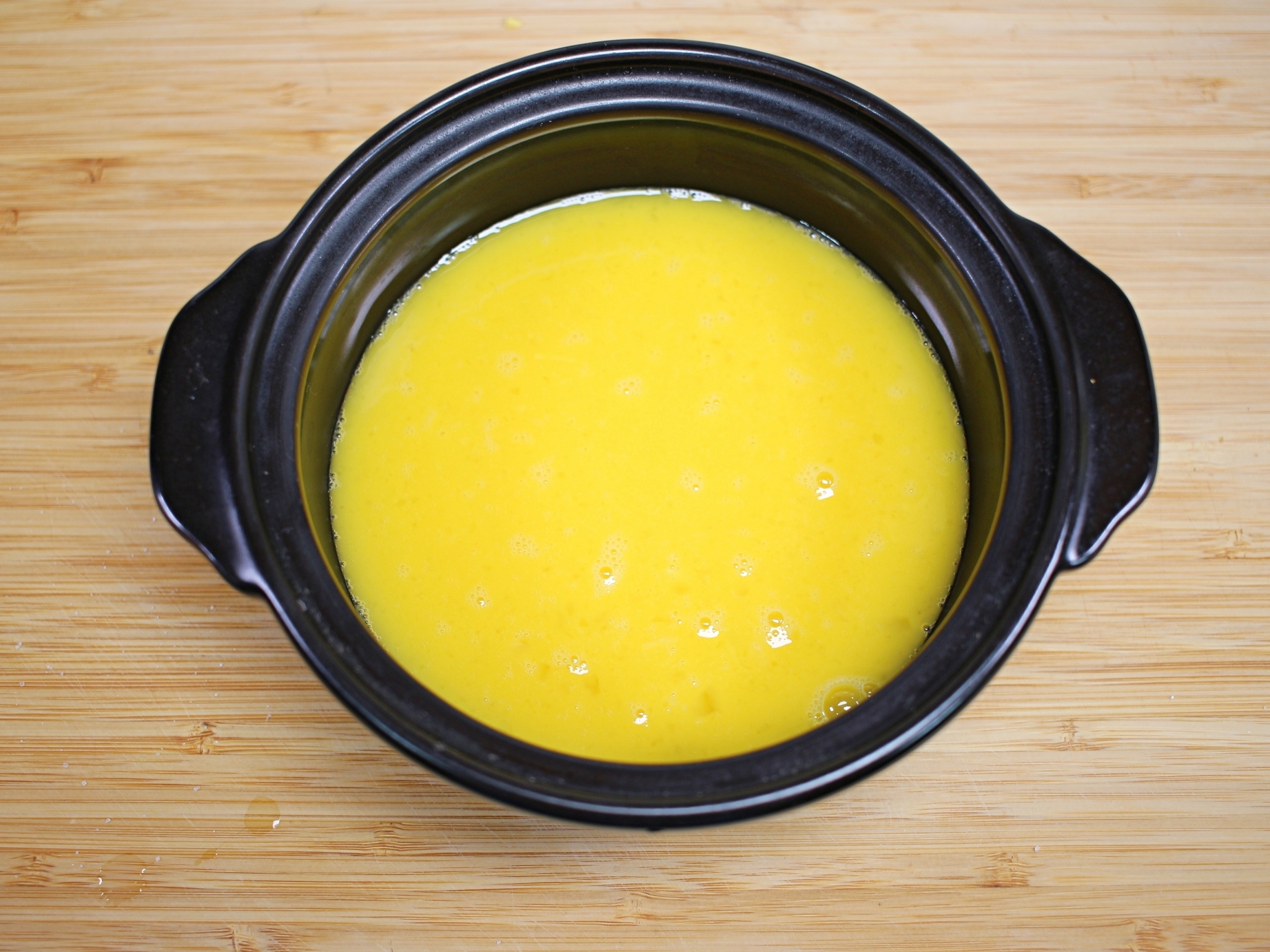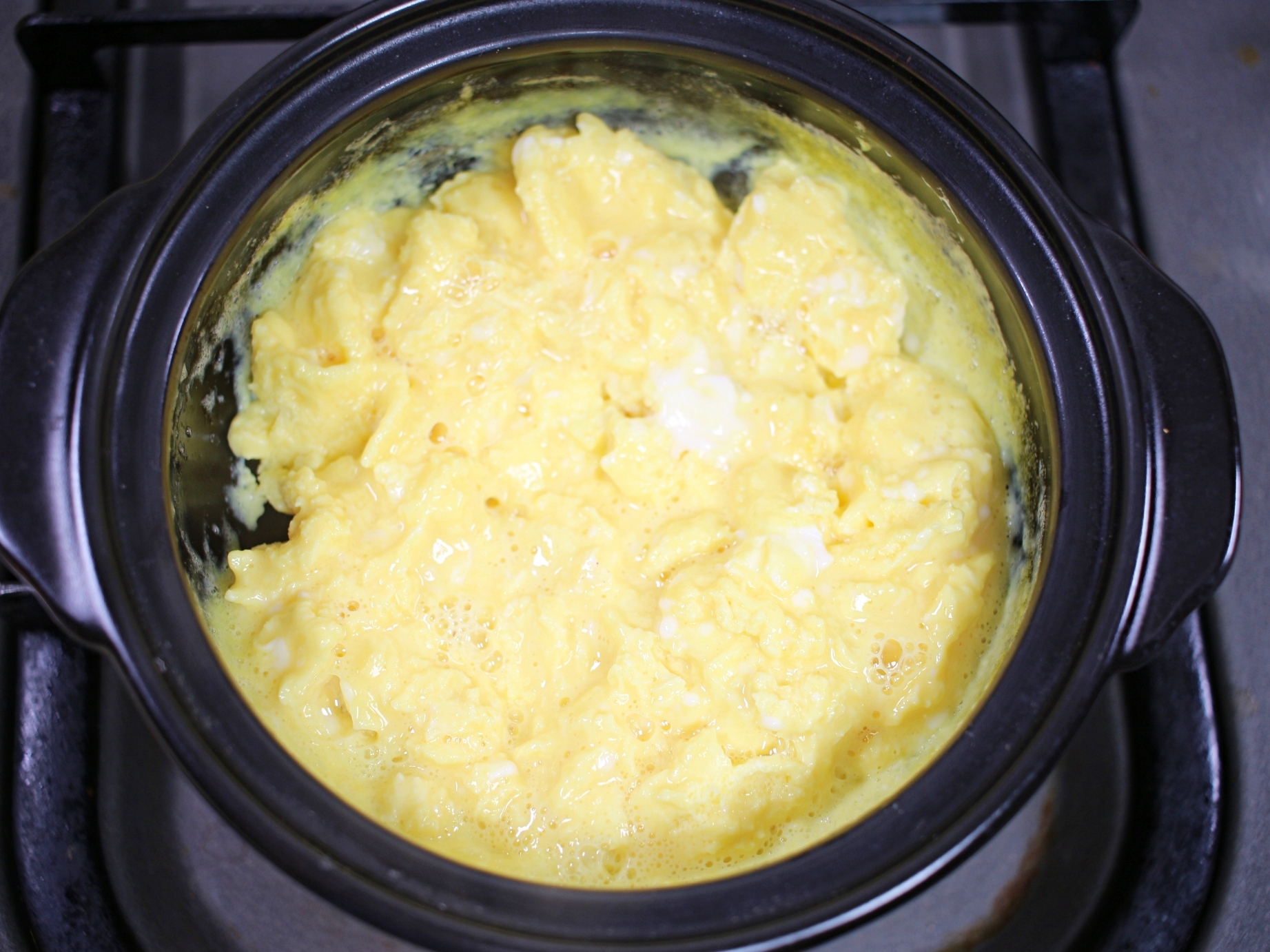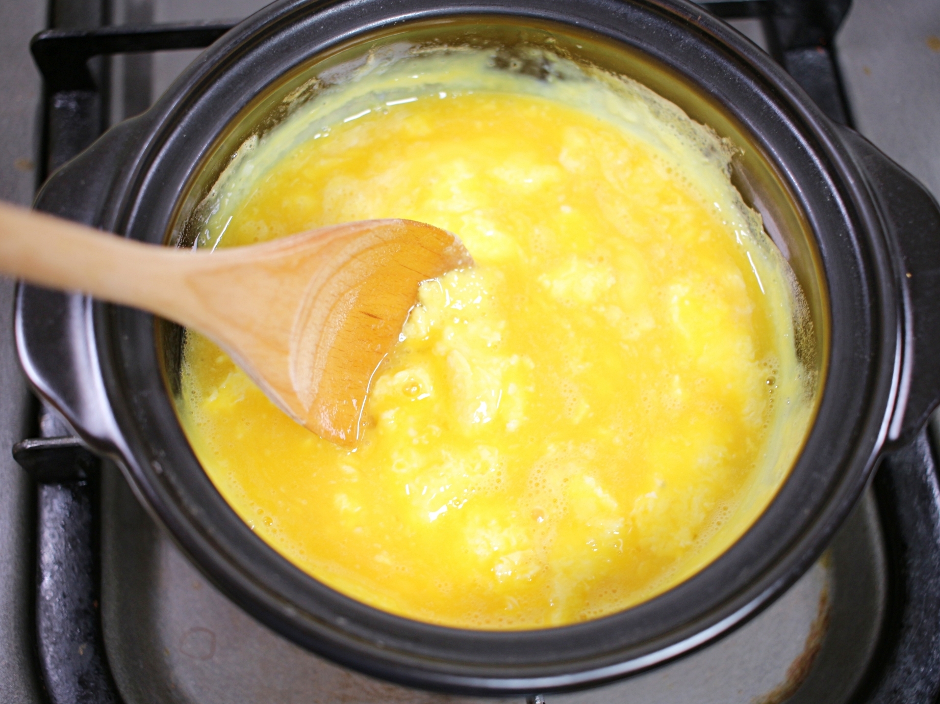 뚝배기에 계란물을 붓고 약불에서 조리 시작.
