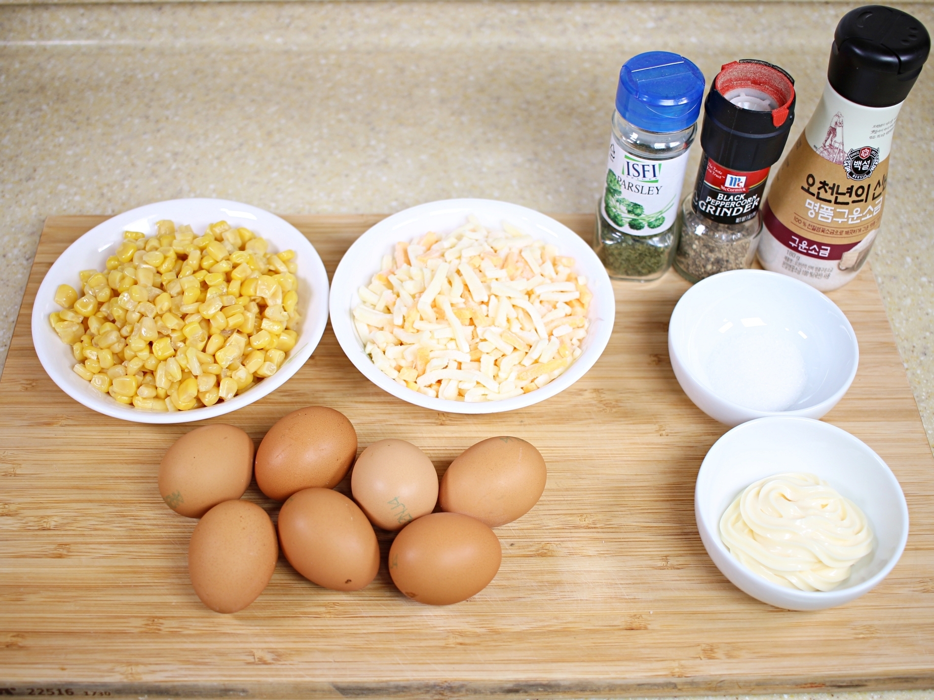재료는 계란, 캔옥수수, 모짜렐라치즈,