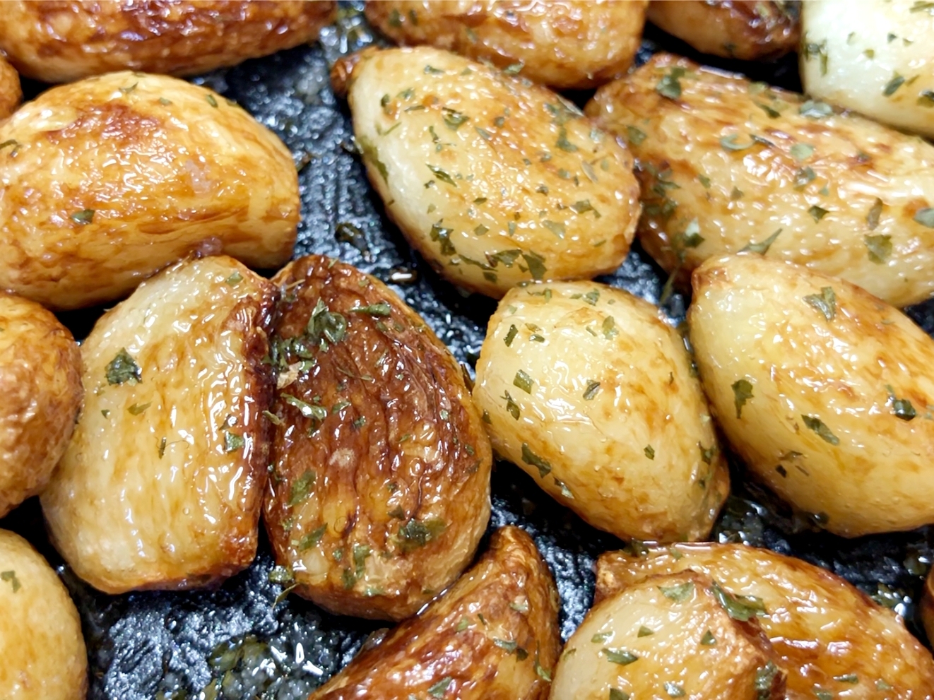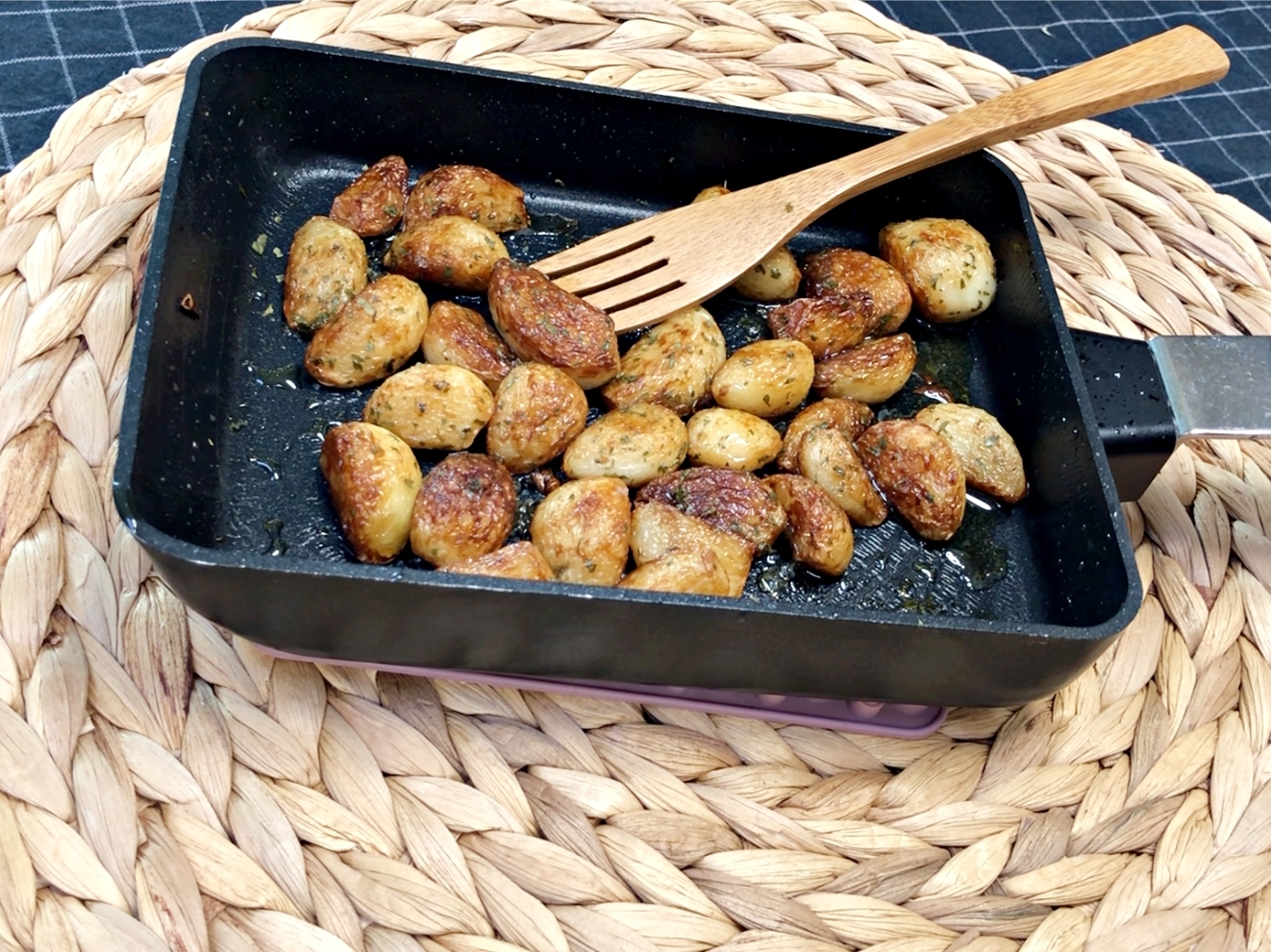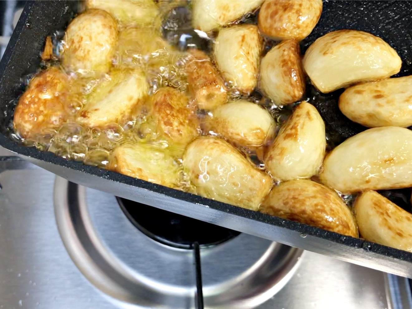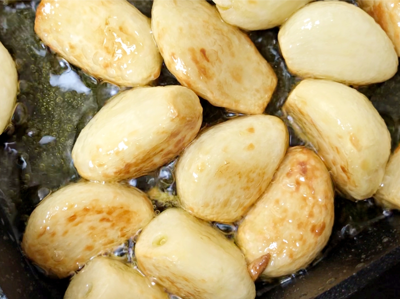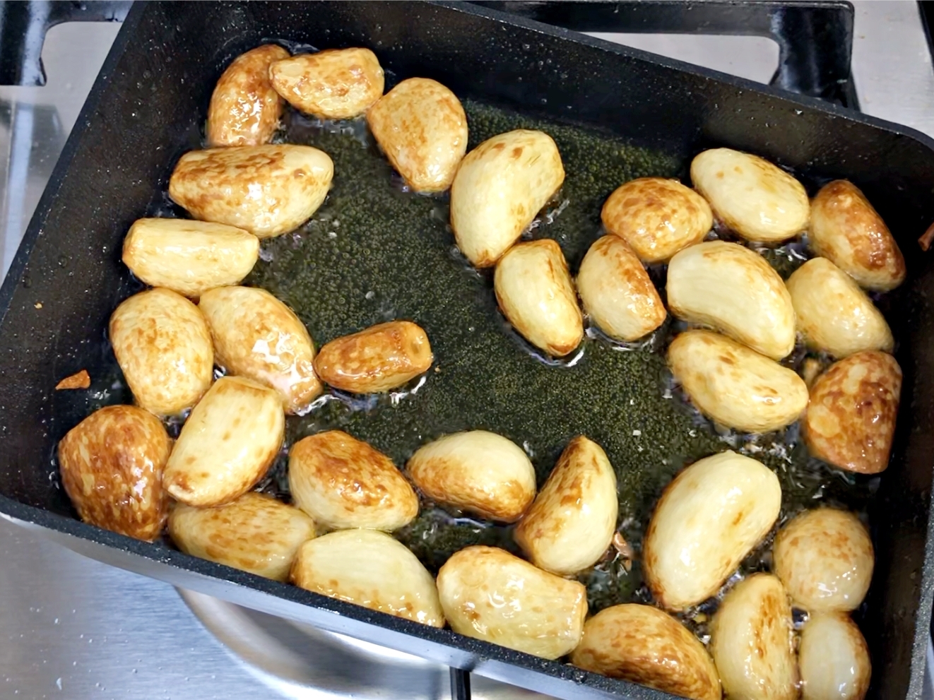 마늘을 골고루 굴려서 전체적으로 노릇하게 구워주세요.