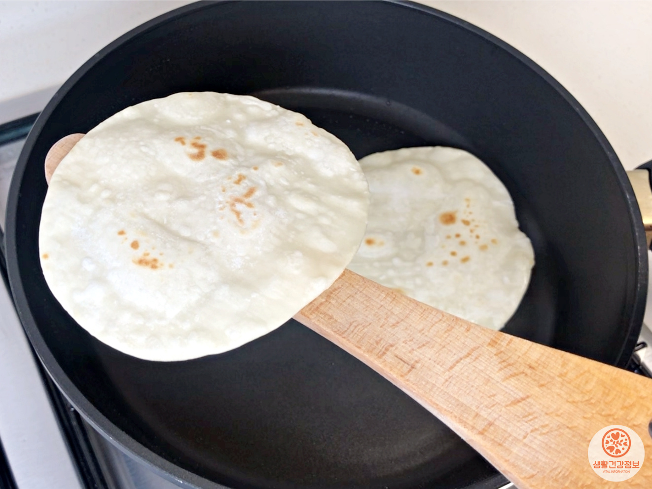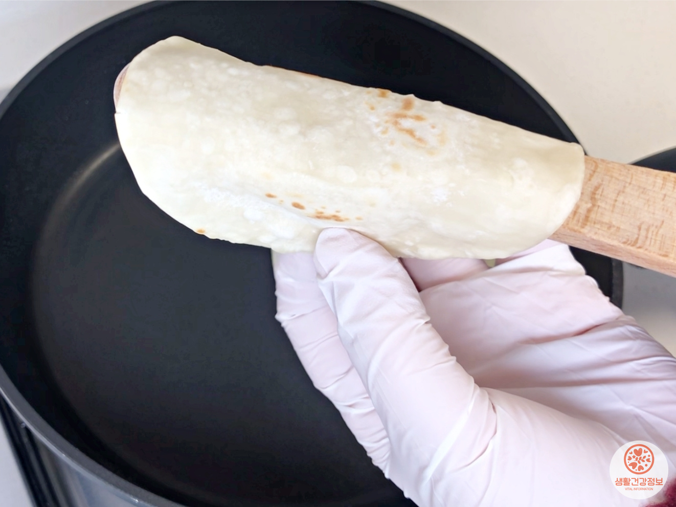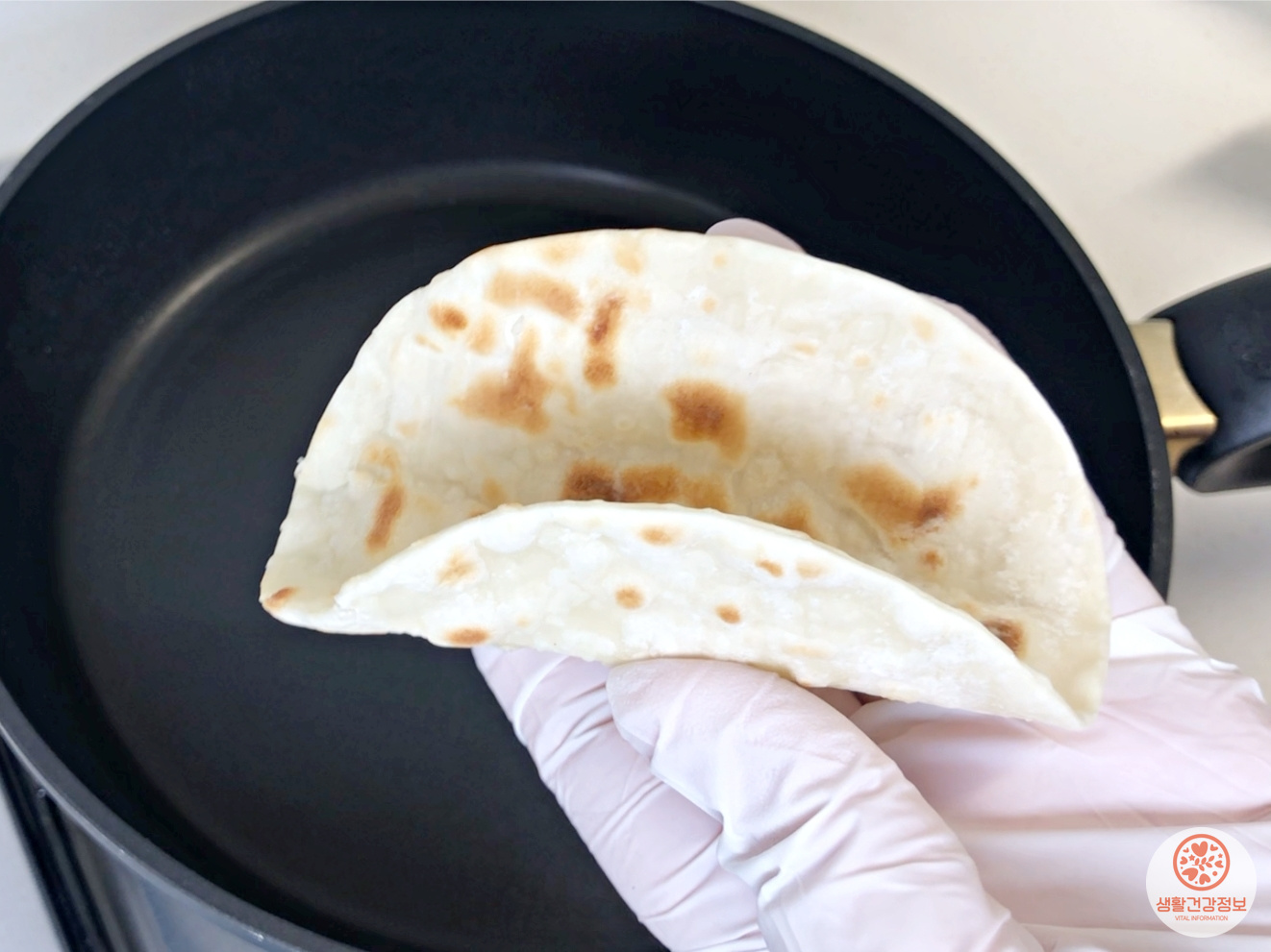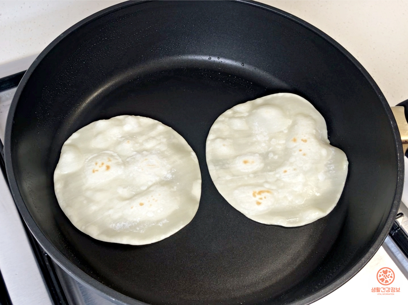 중불로 달군 후라이팬에서 만두피를 구워주세요.