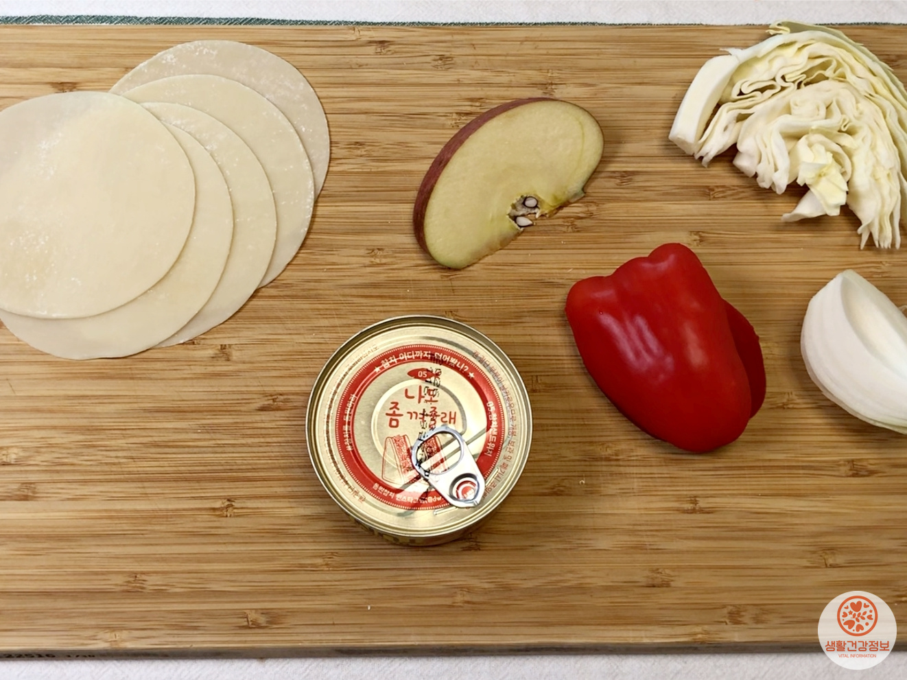 재료는 만두피, 양배추, 사과, 양파, 파프리카, 참치 준비했어요.