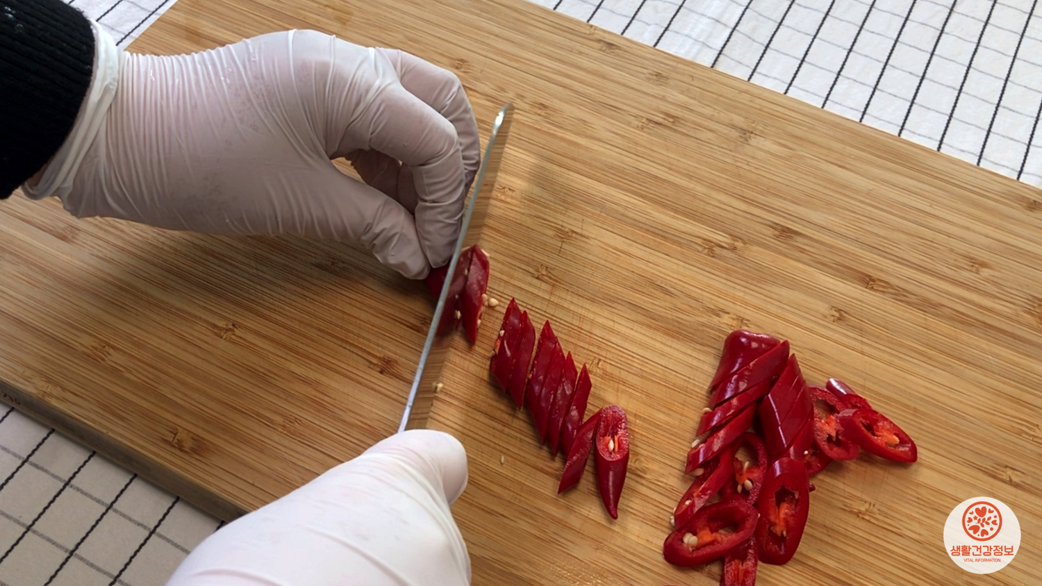 홍고추도 어슷하게 썰면 재료 준비는 끝이에요.