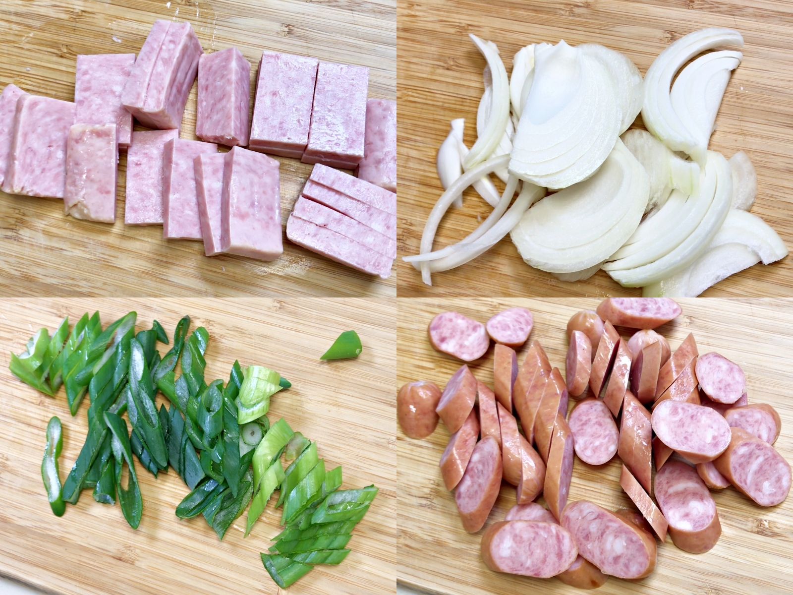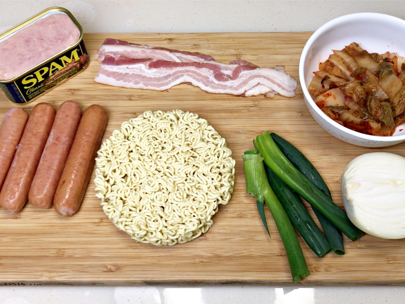 스팸, 소시지, 베이컨, 라면사리, 김치, 대파, 양파 준비했고요.