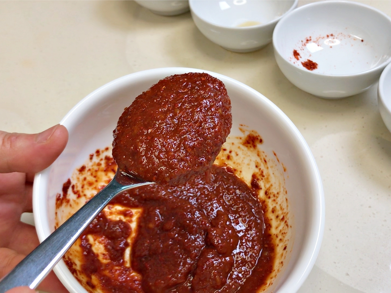 양념장은 고추장1, 간장2, 멸치액젓1, 맛술1, 고춧가루3, 다진마늘2 넣고