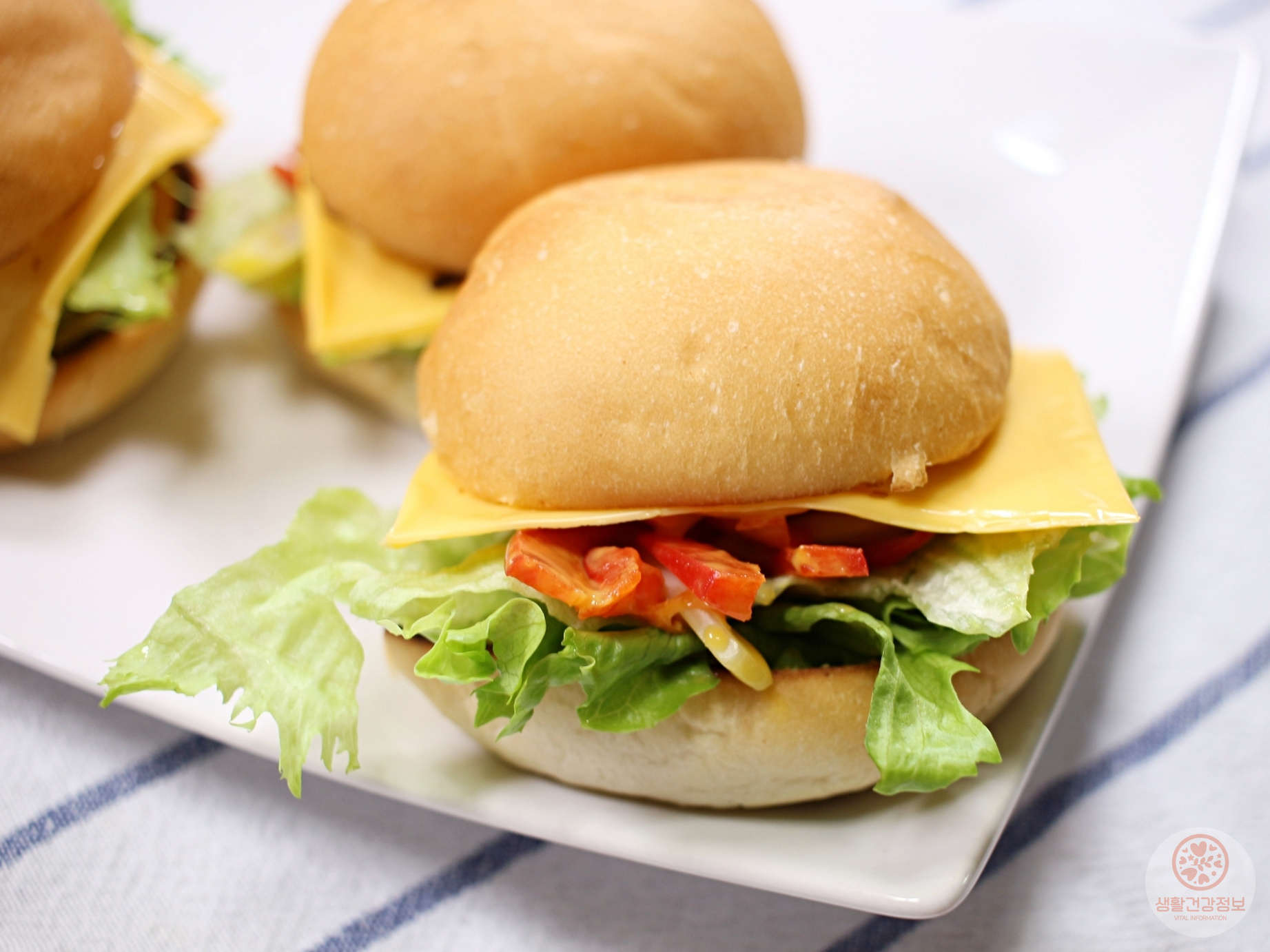 모닝빵 사이즈에 맞춰서 양상추, 슬라이스치즈 올려주시고요.