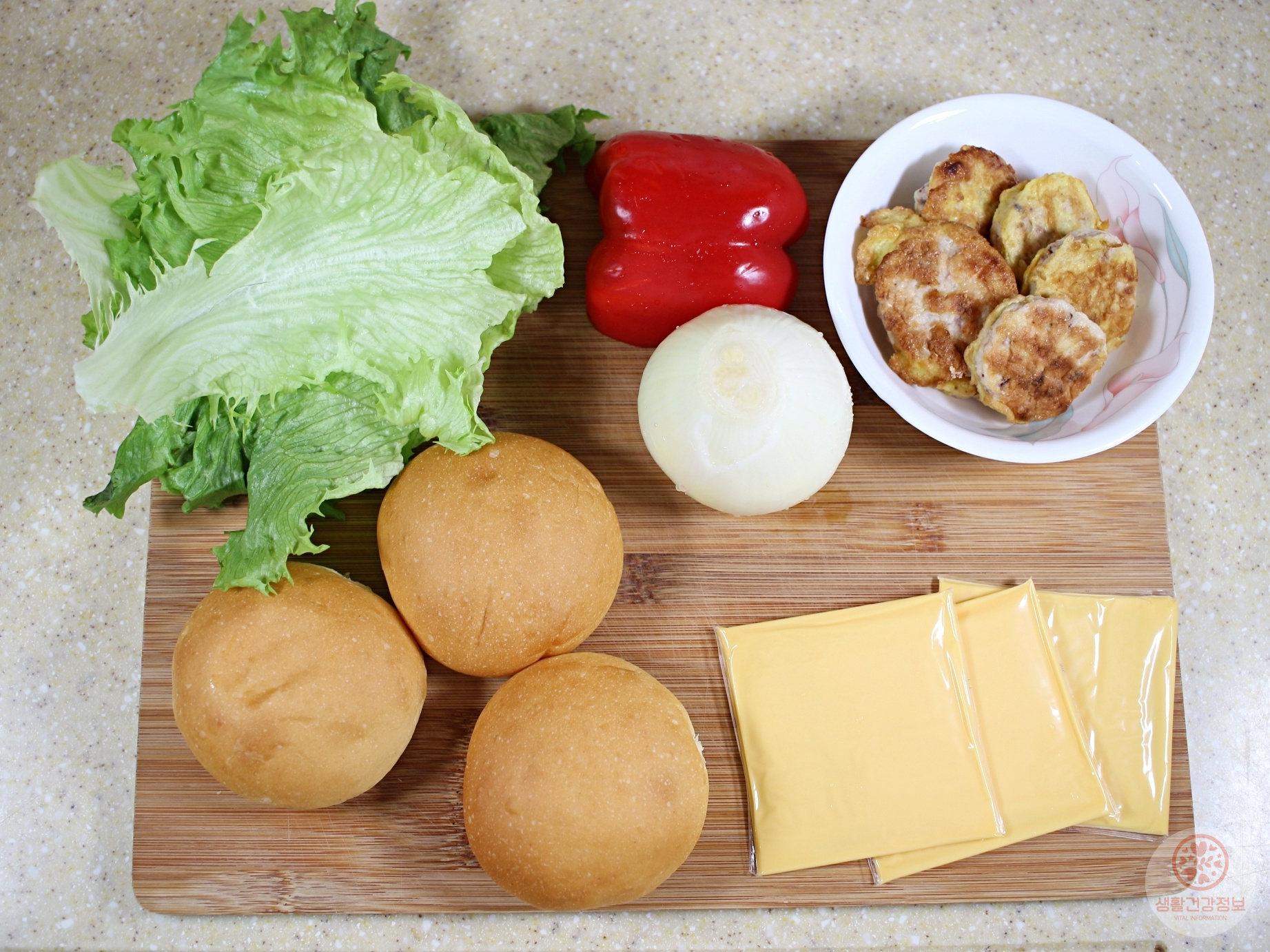 재료는 동그랑땡, 모닝빵, 슬라이스치즈, 양상추,