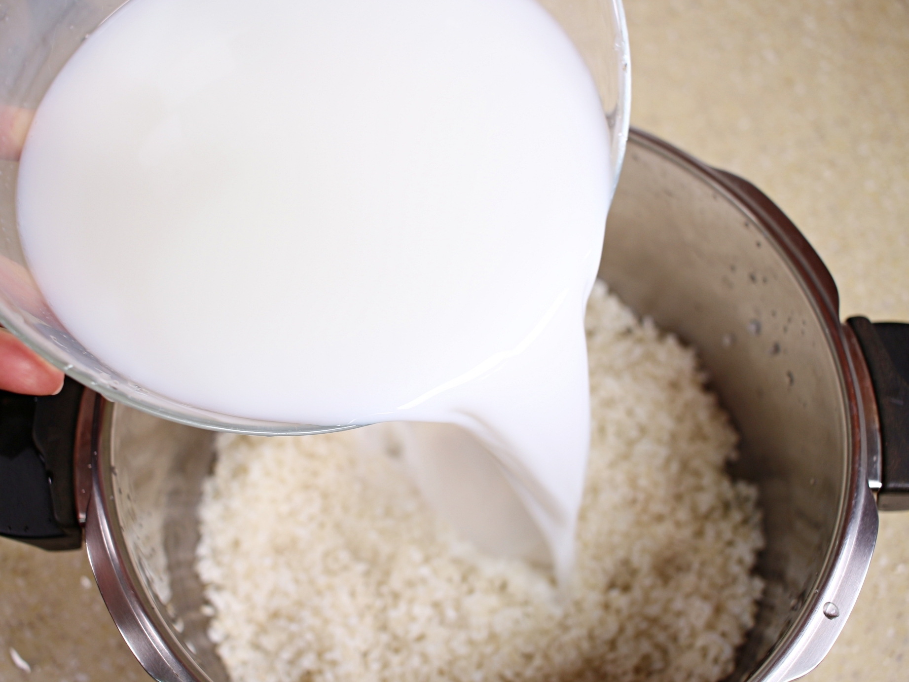 맹물과 우유를 3:1 비율로 섞어서 밥물을 맞춰주세요.