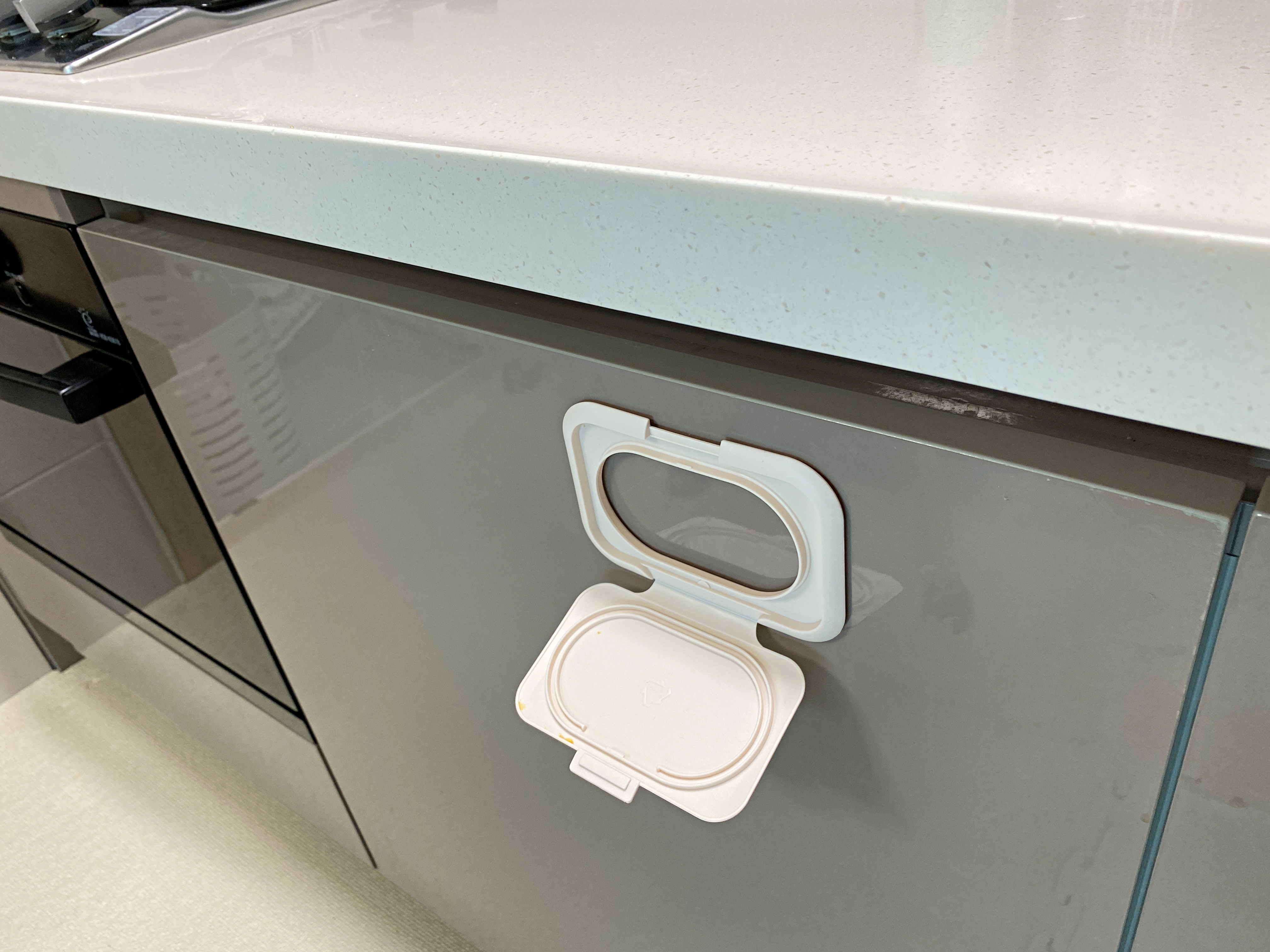 물티슈뚜껑을 싱크대 문에 붙이는 거예요.