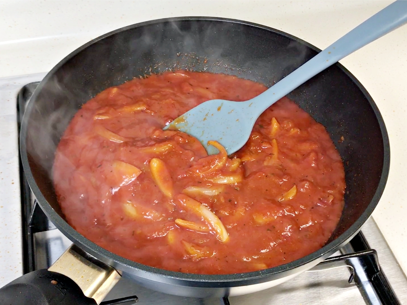 그다음 토마토소스를 넣고 한번 끓여주세요.