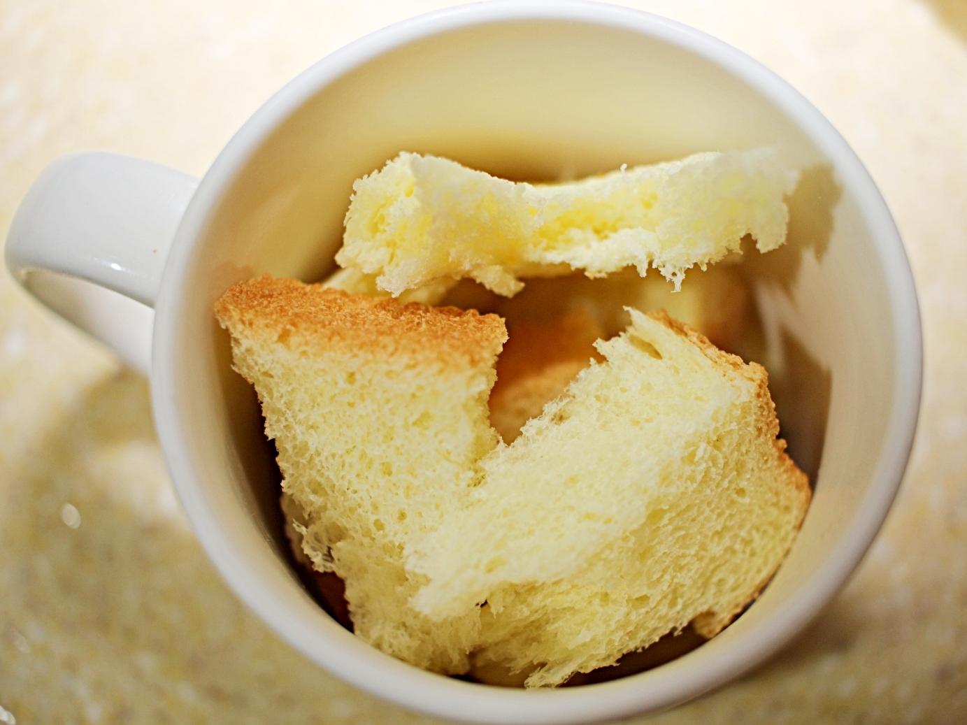 넉넉한 크기의 머그컵에 식빵 1쪽을 작게 잘라서 넣어주세요.