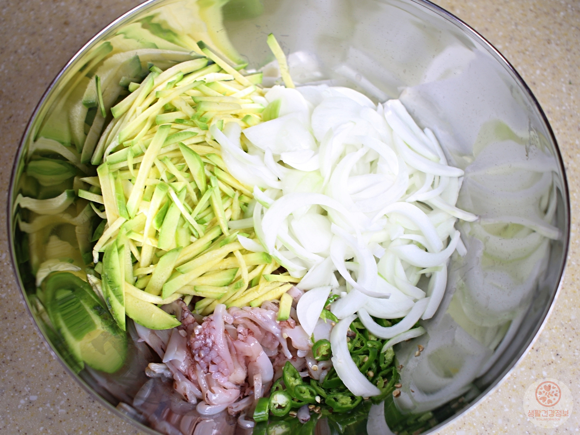 오징어, 애호박, 양파의 크기를 맞춰서 썰면