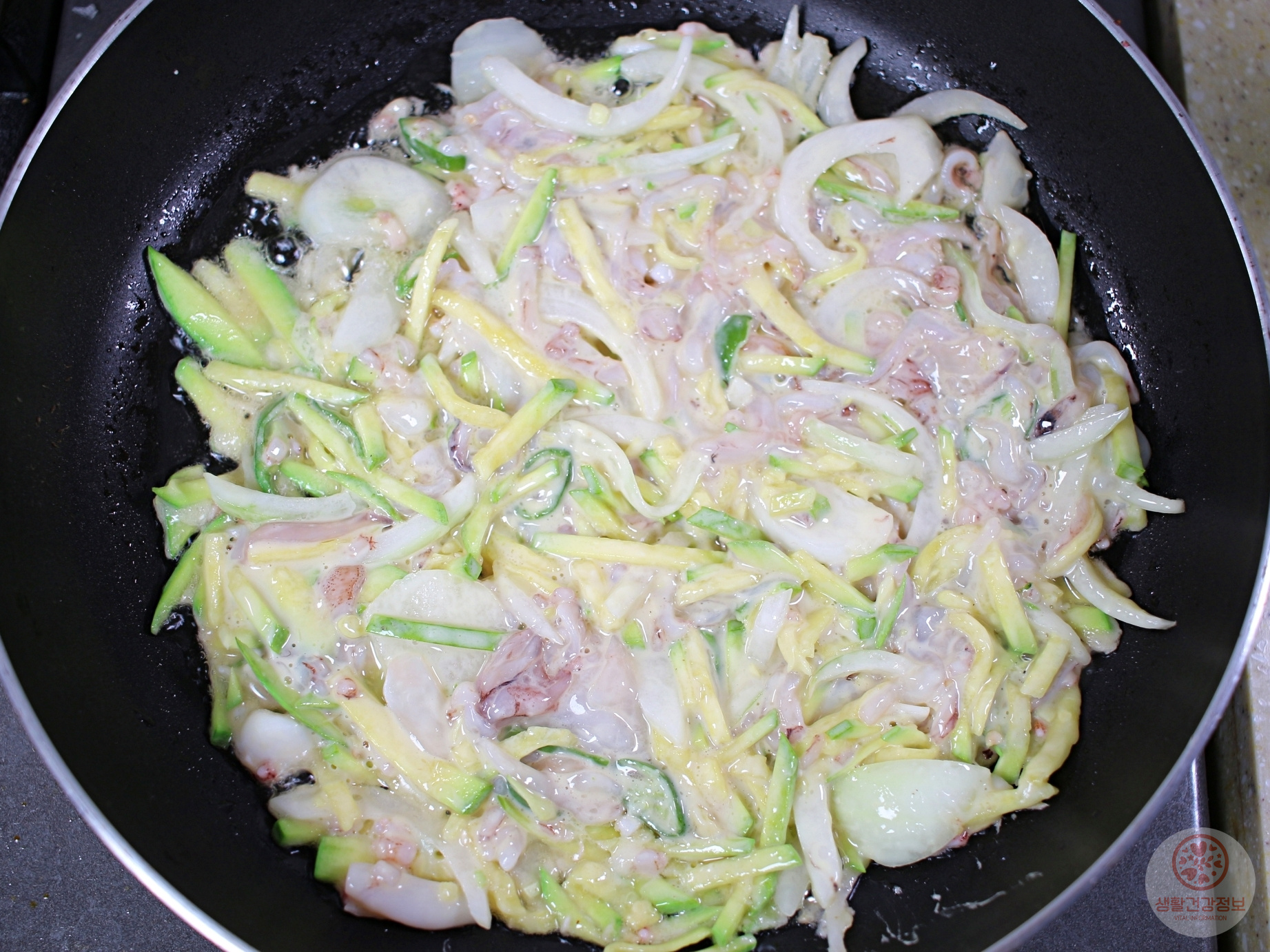 애호박이랑 오징어, 양파를 넉넉하게 넣어서