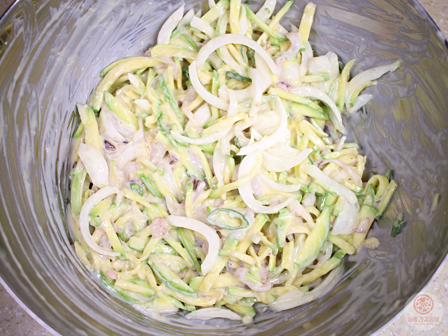 애호박이랑 오징어, 양파를 넉넉하게 넣어서