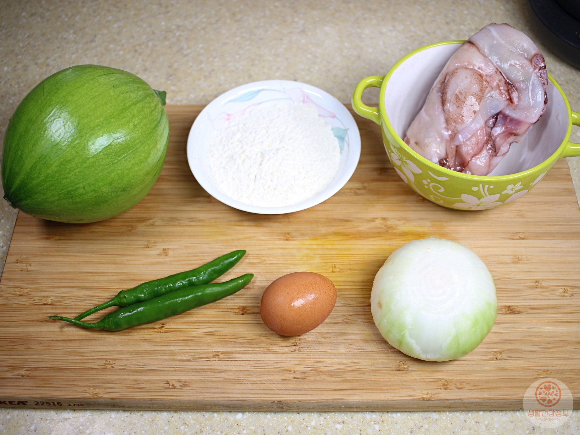 재료는 애호박, 오징어, 부침가루, 청양고추,