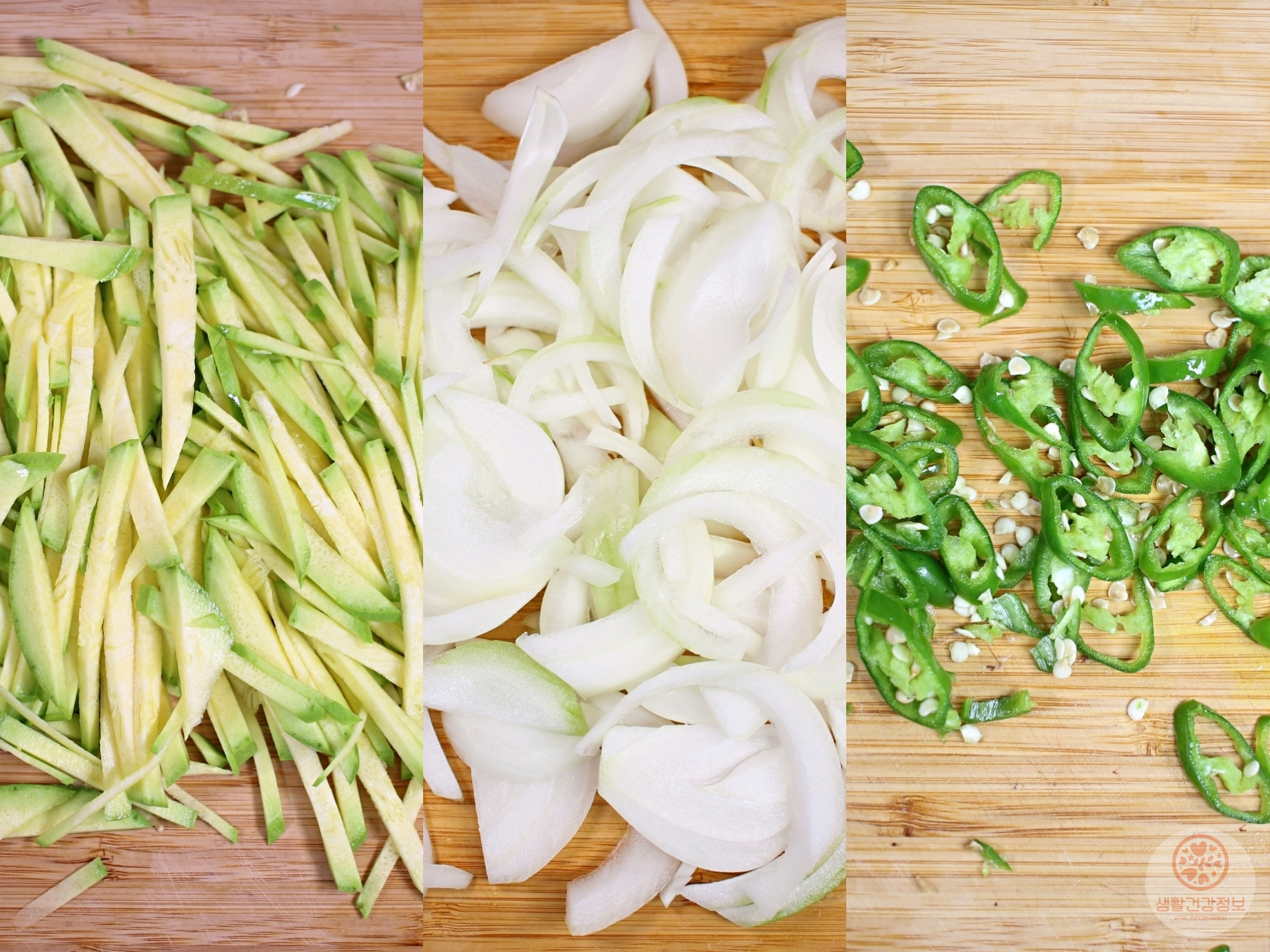 오징어, 애호박, 양파의 크기를 맞춰서 썰면