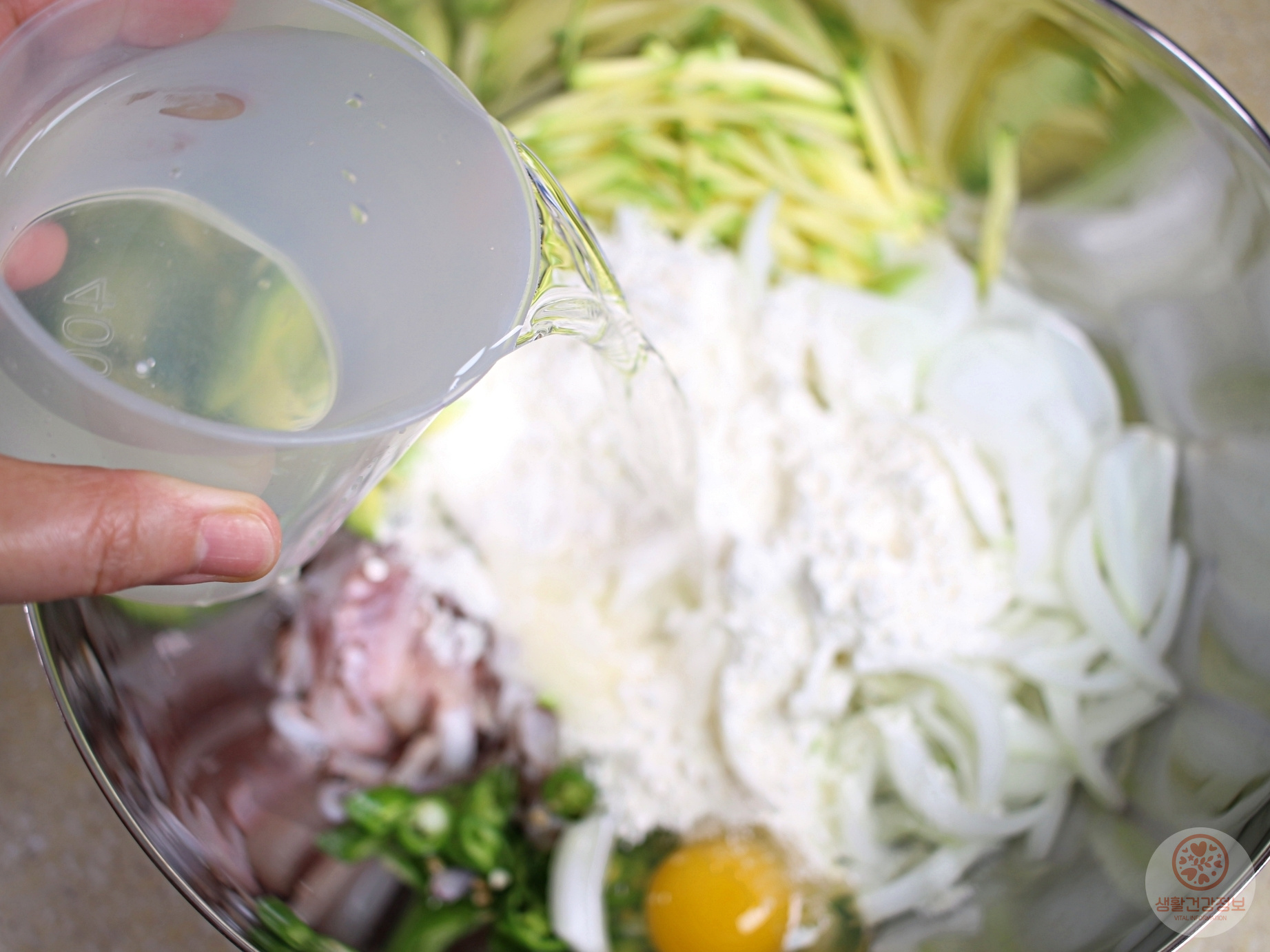 반죽을 섞어가면서 농도를 맞춰서 넣어주셔야 돼요.