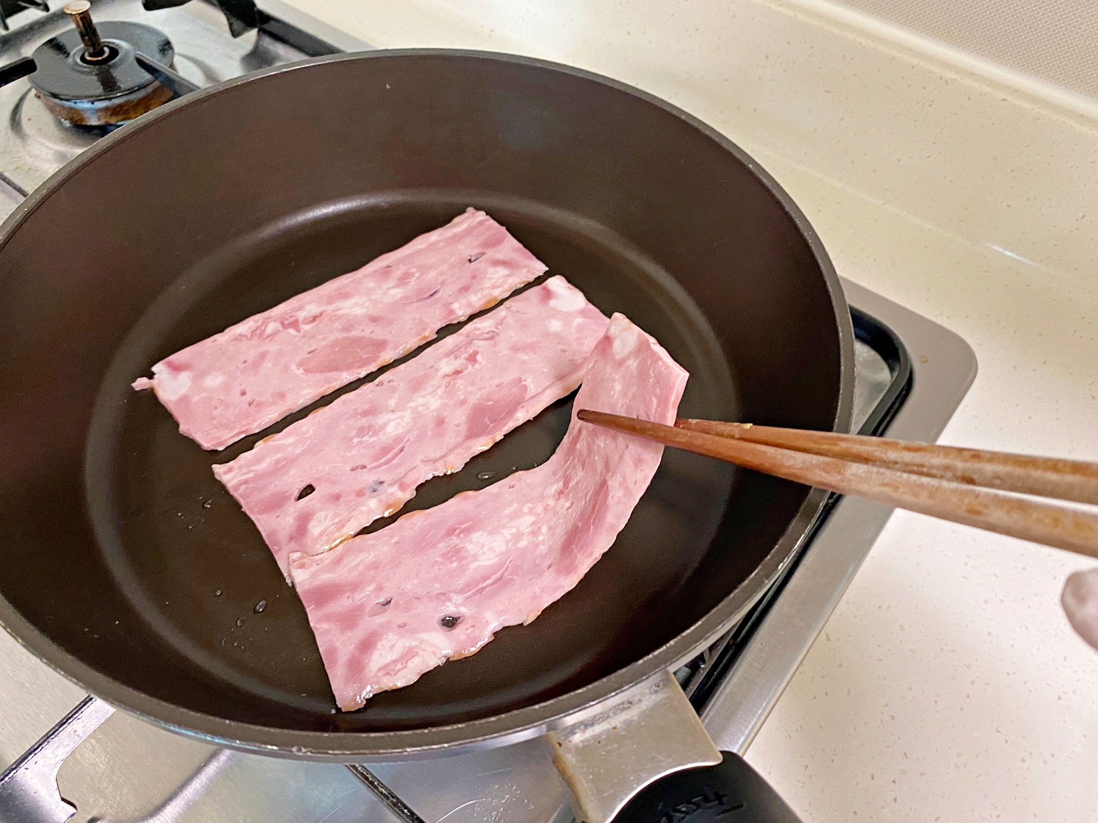 팬의 온도가 올라가면서 베이컨 속 기름이 나올거예요.