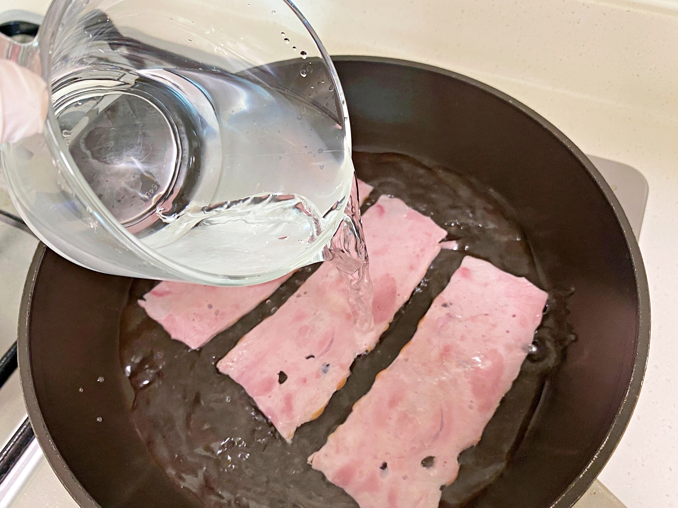 베이컨이 잠길랑 말랑하는 정도만 부어주시면 돼요.