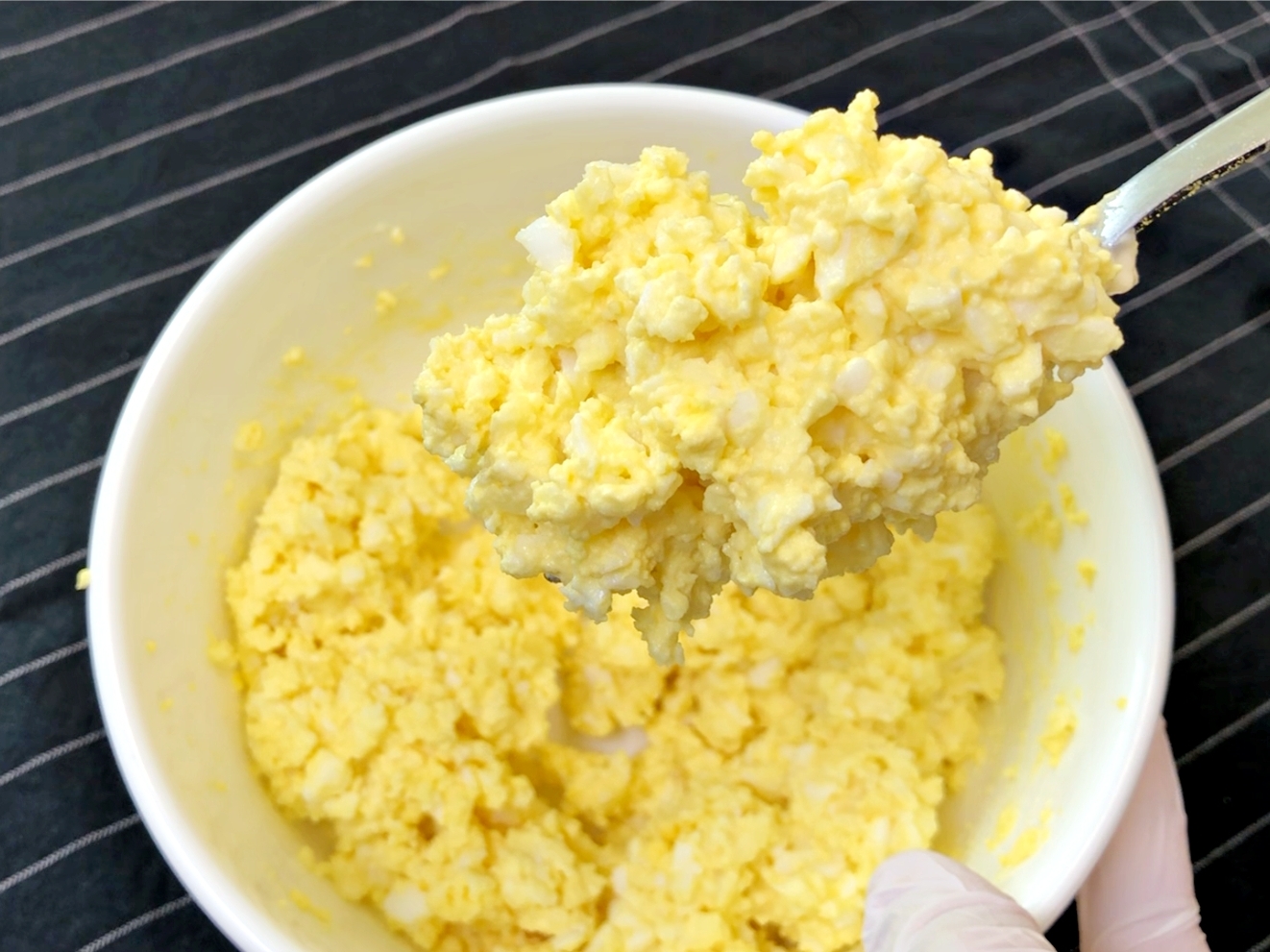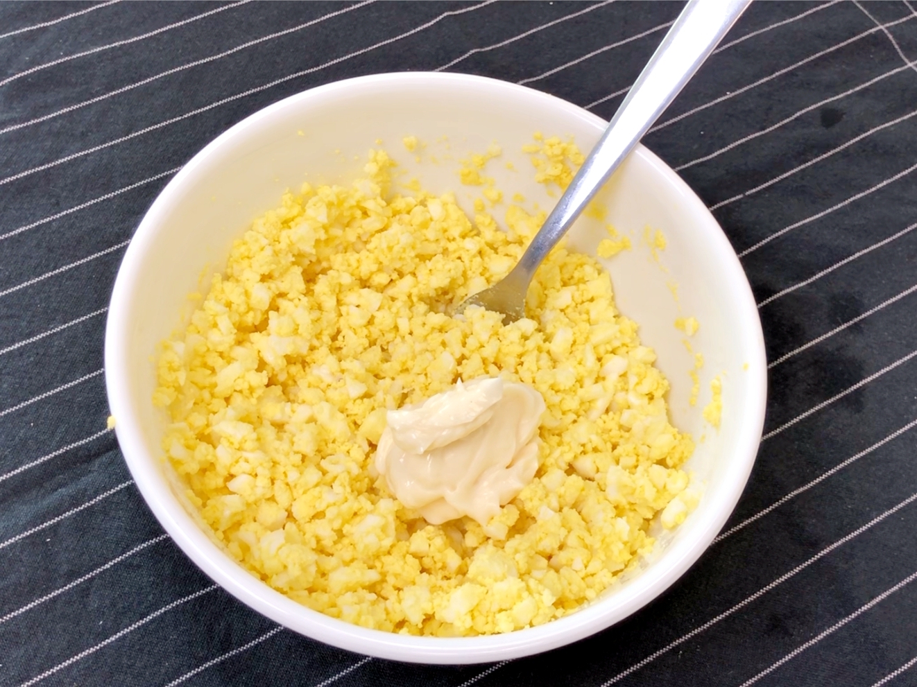 완숙으로 삶은 후 잘 으깨서 마요네즈와 섞어주세요.