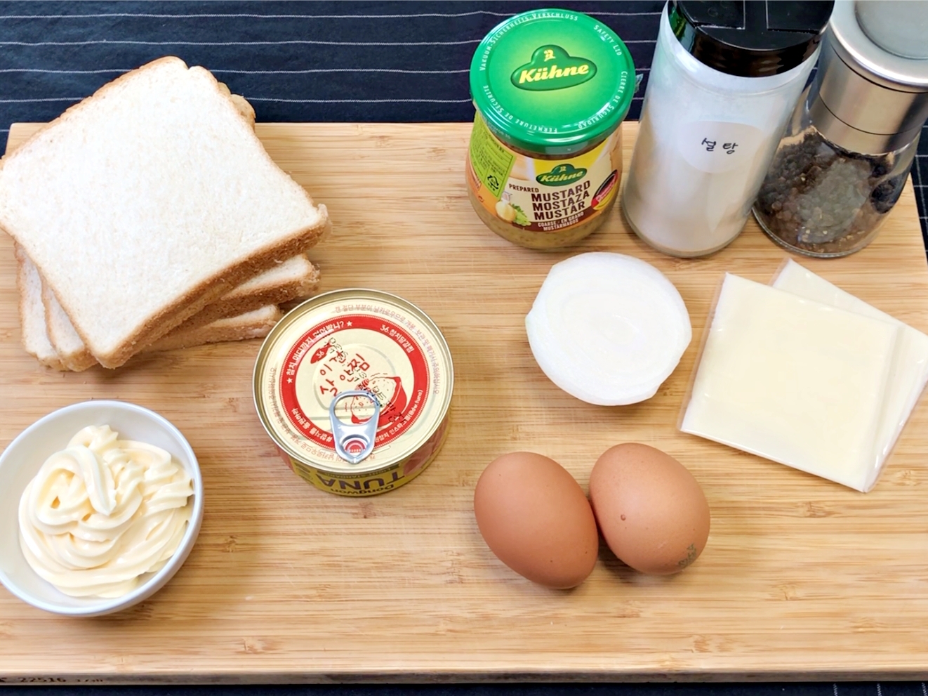 재료는 식빵, 계란, 참치캔, 양파, 슬라이스치즈.