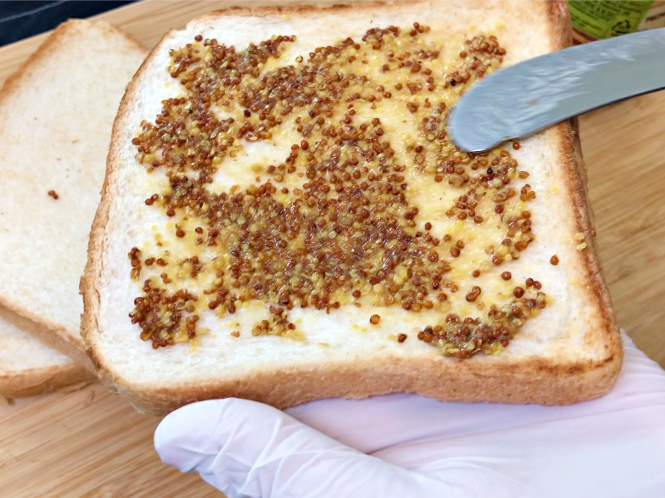 구운 식빵 한쪽면에 홀그레인 머스타드를 발라요.