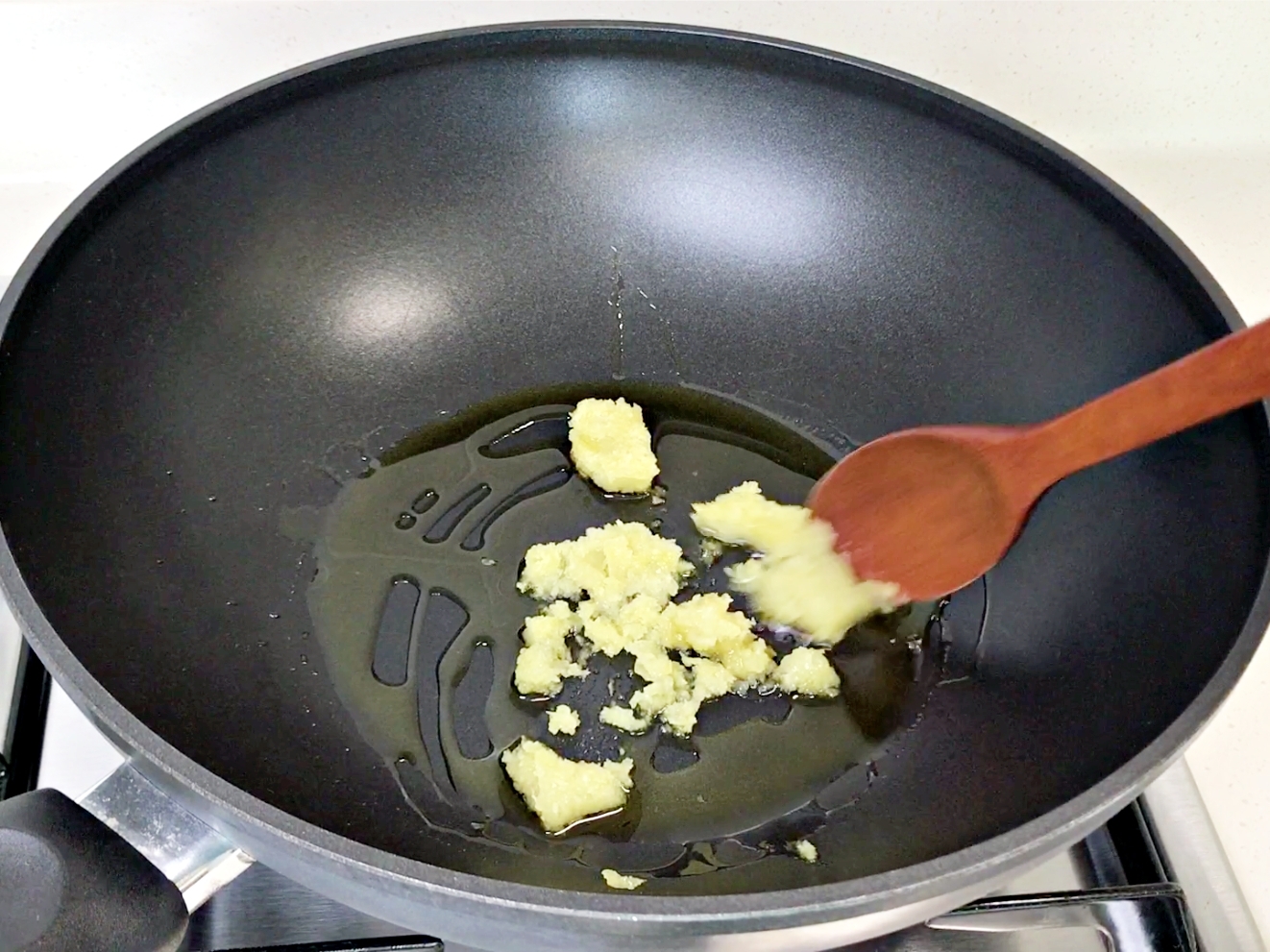 팬에 기름을 넉넉하게 두르고 다진 마늘을 먼저 볶아요.