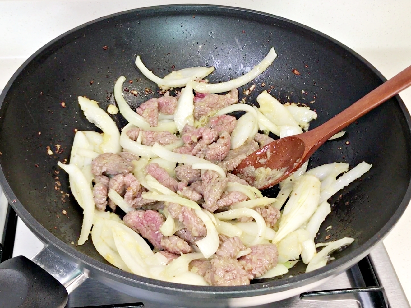소고기를 넣고 중약불에서 부드럽게 익혀주세요.