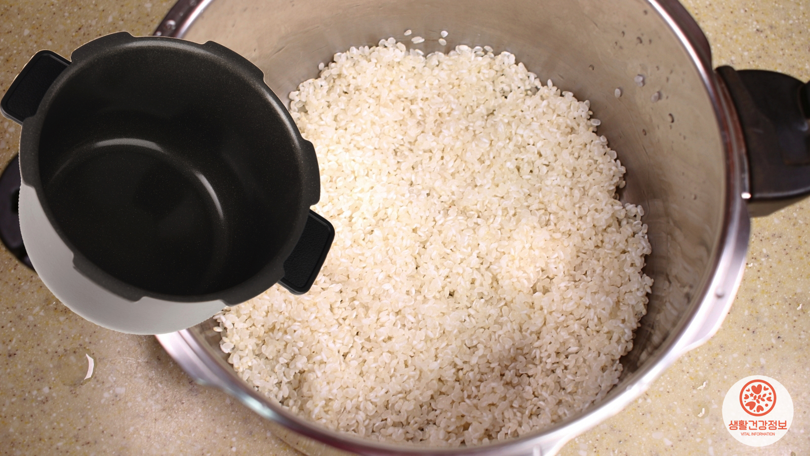 깨끗하게 세척한 쌀을 밥솥에 넣어요.