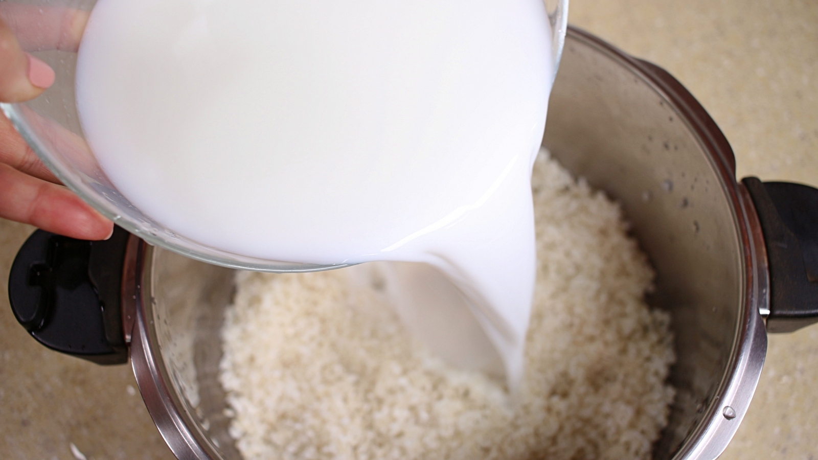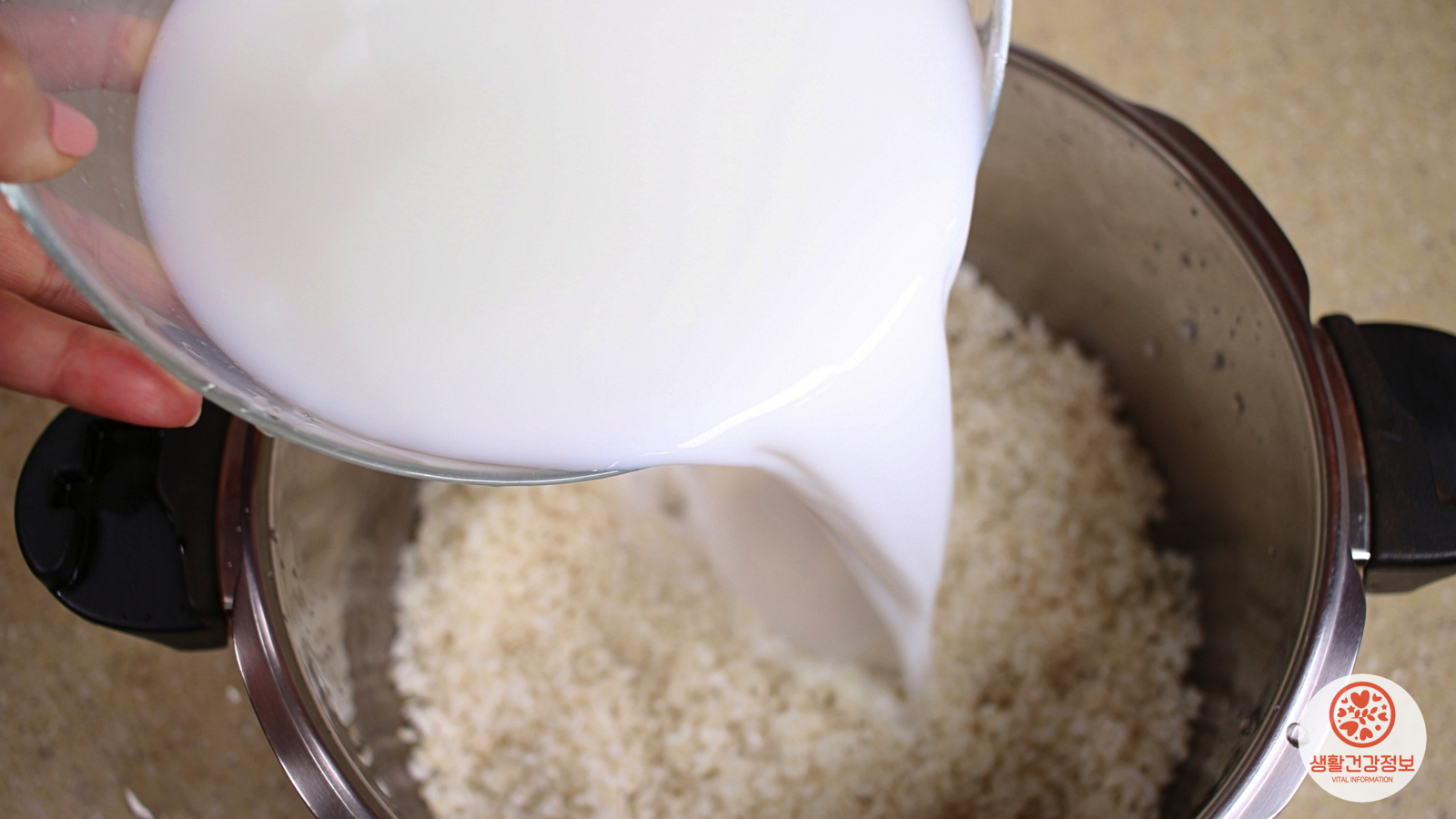 우유를 섞은물로 평상시대로 밥물을 맞춰주세요.