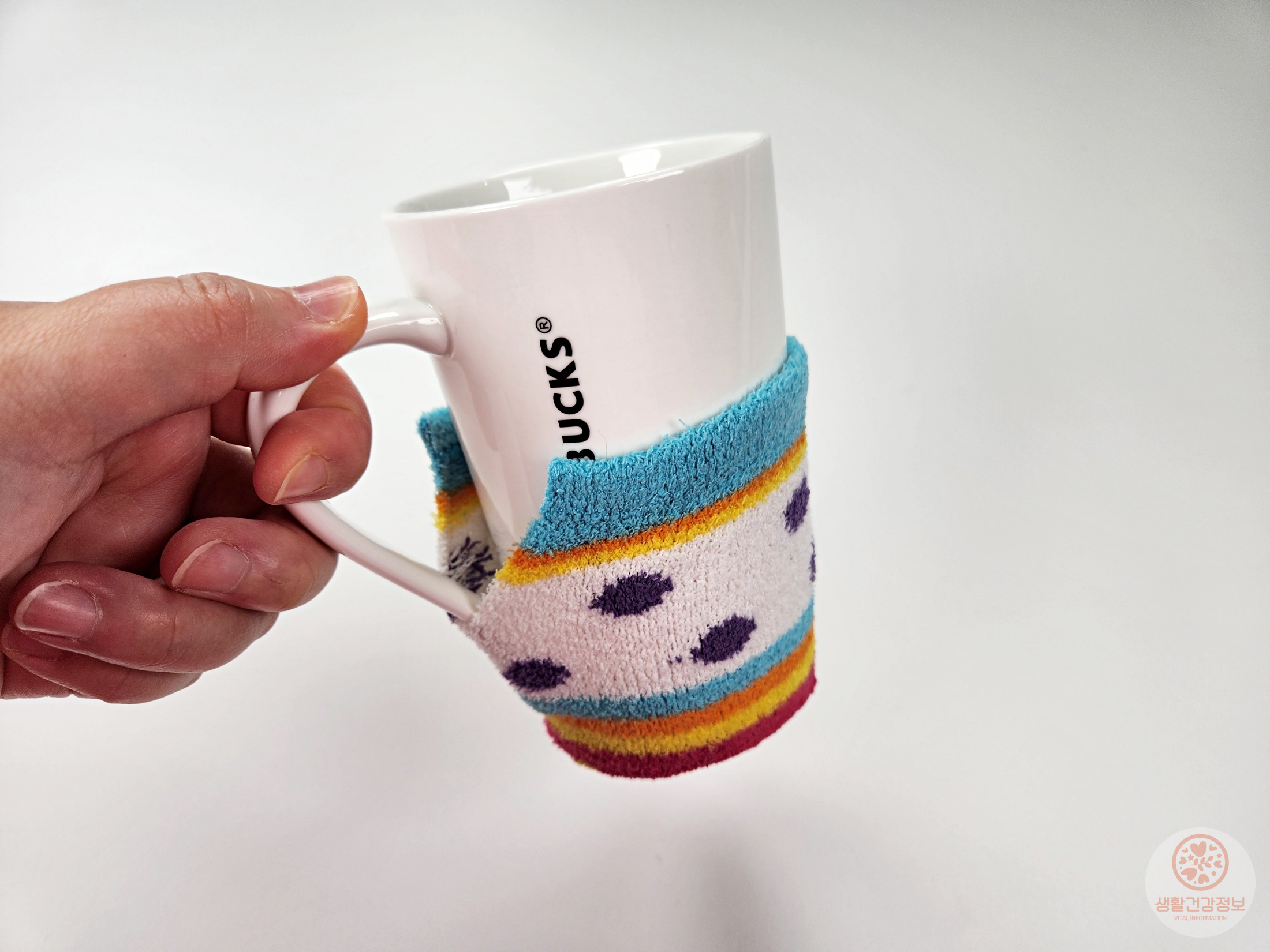 수면양말 발목 부분을 잘라서 컵에 씌워보세요.