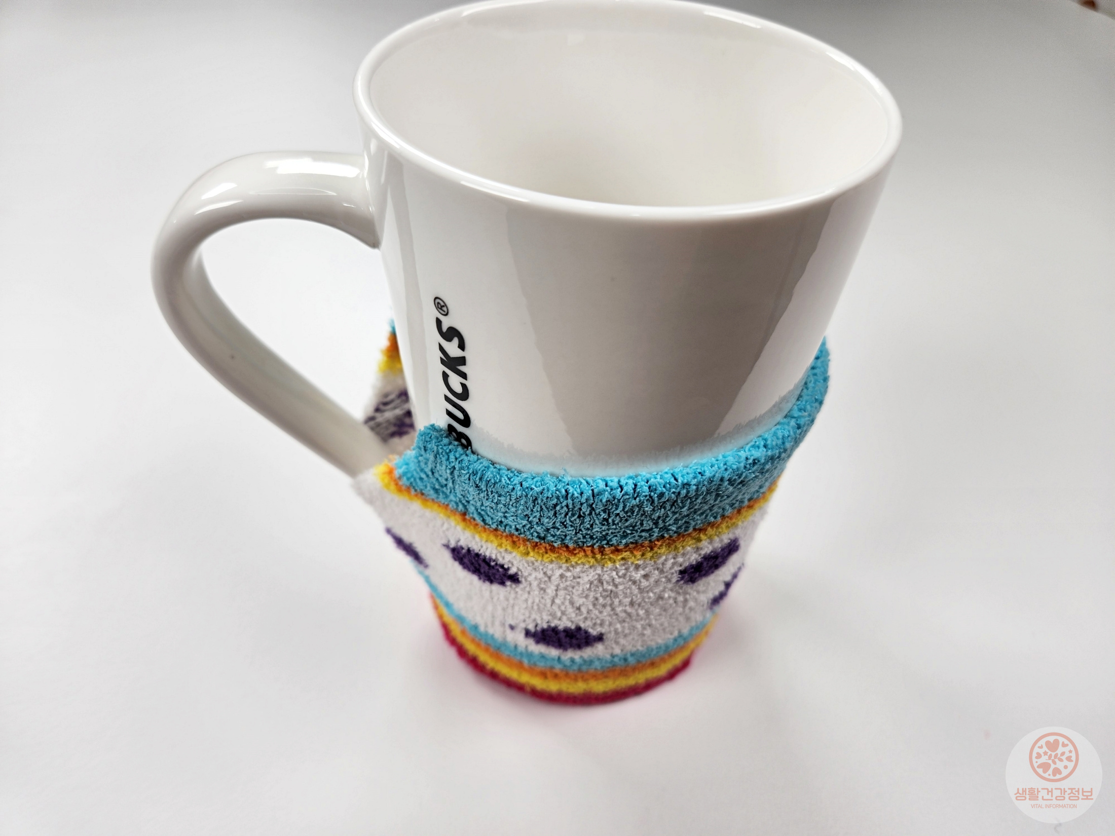 수면양말 발목 부분을 잘라서 컵에 씌워보세요.