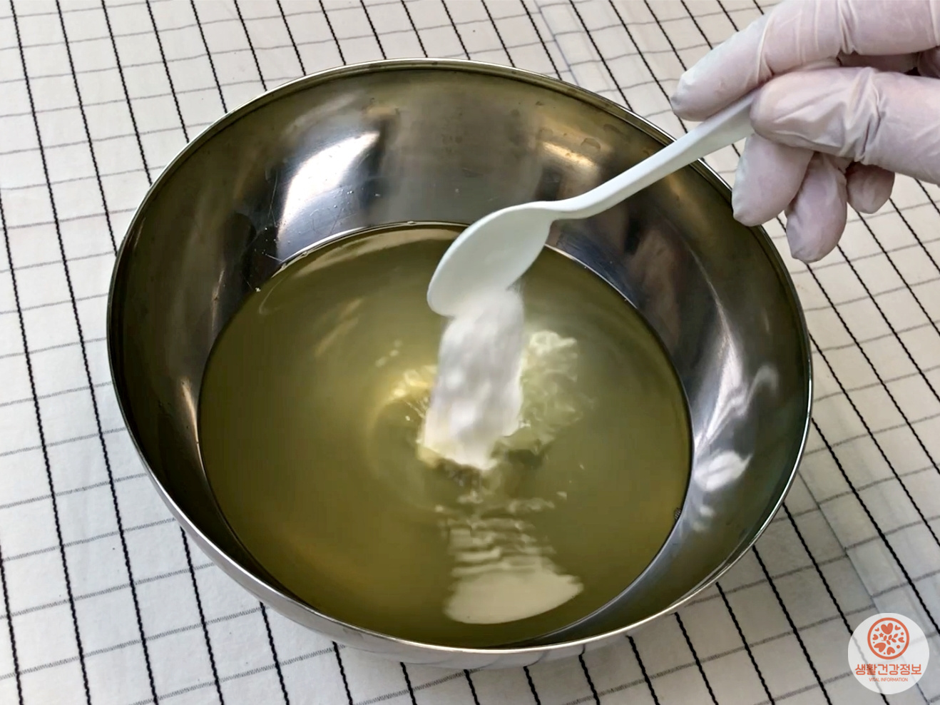 여기에 시금치 데친물을 넣어서 헹궈보세요.