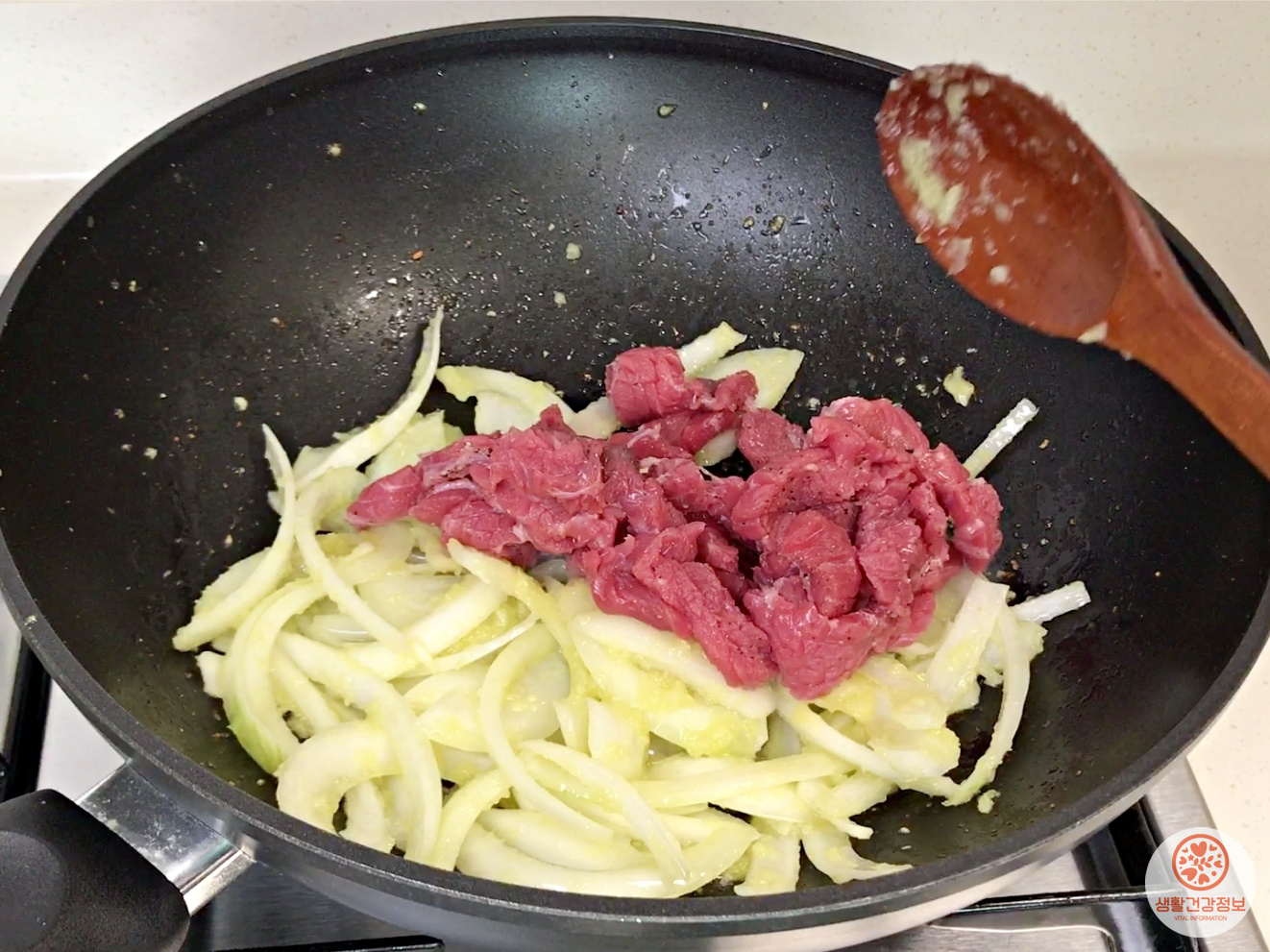 양파가 투명해지면 고기를 넣고 볶아주세요.