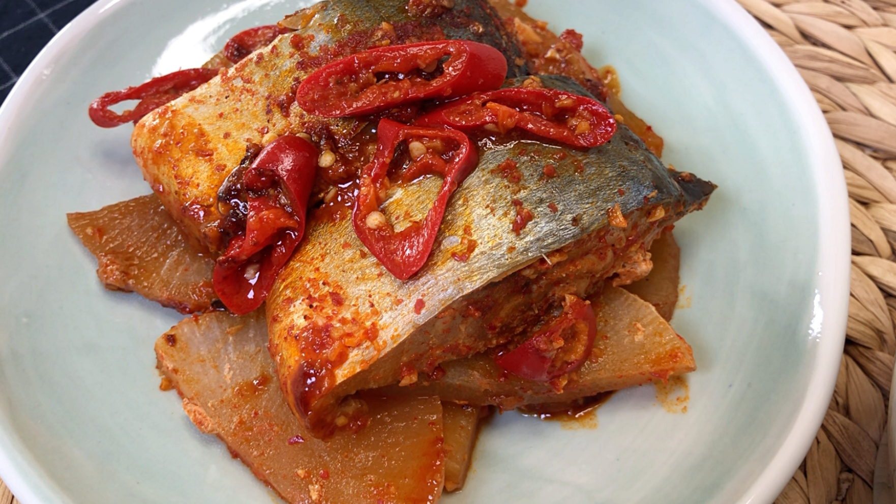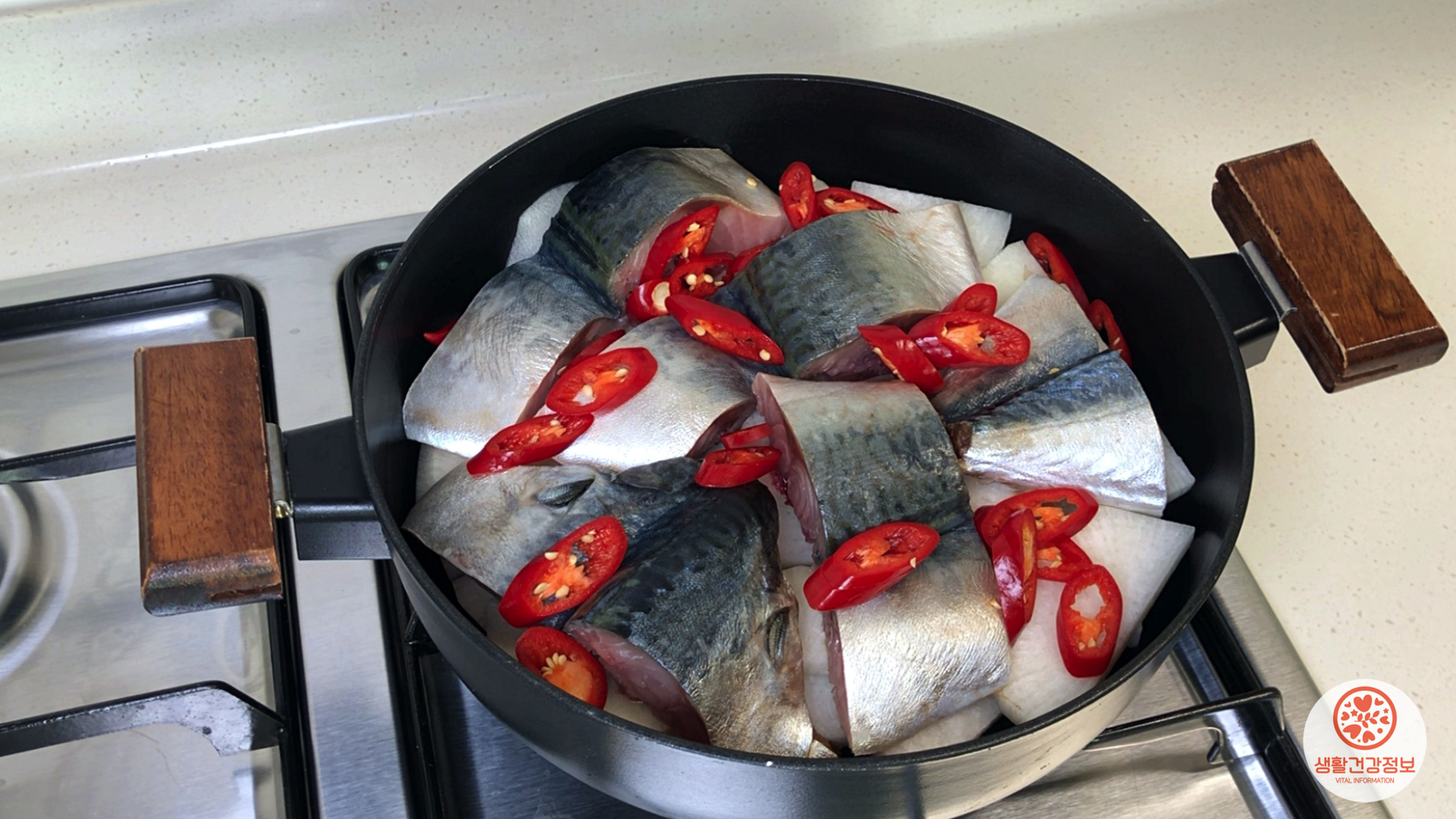 고등어 1마리, 무, 홍고추,
