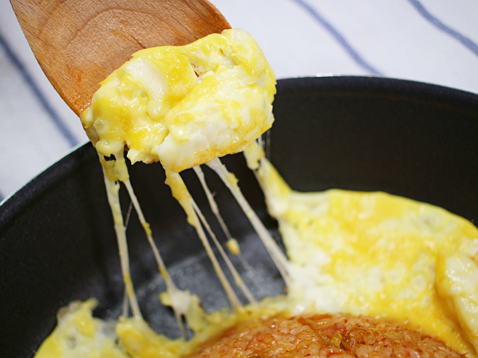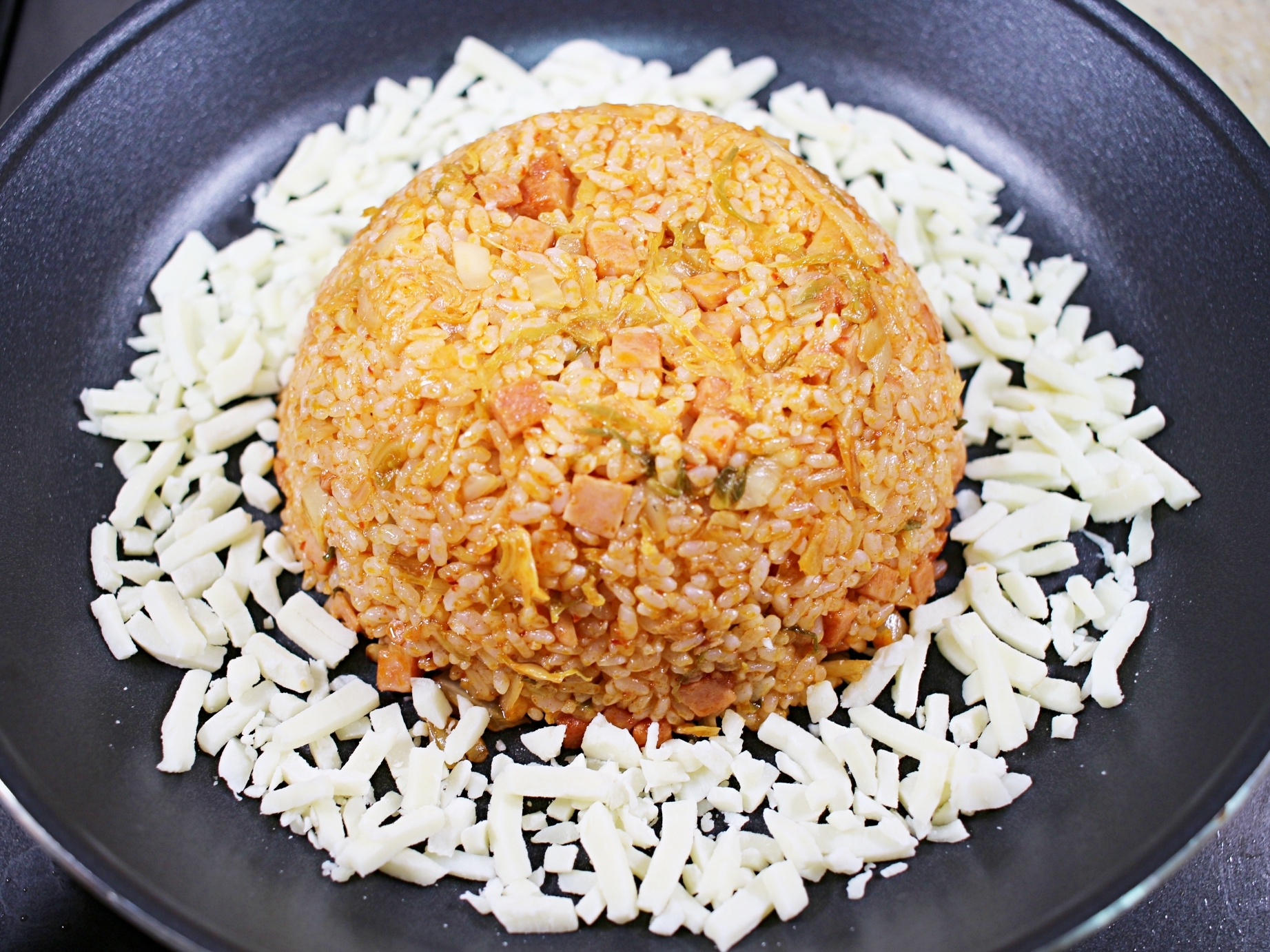 재료는 찬밥, 김치, 달걀, 치즈, 고추장, 햄, 참기름 준비해 주세요.