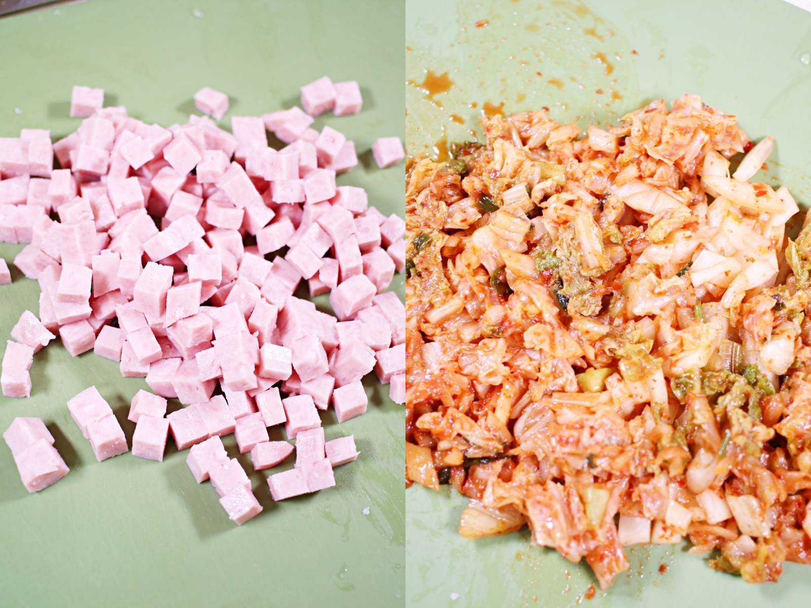 햄은 잘게, 김치는 먹기 좋은 크기로 썰어요.