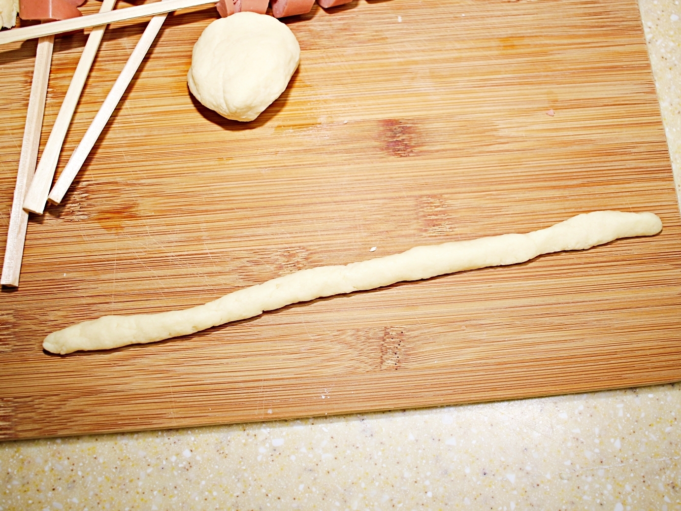 소시지 사이에 반죽을 끼워넣으면 준비 끝~!