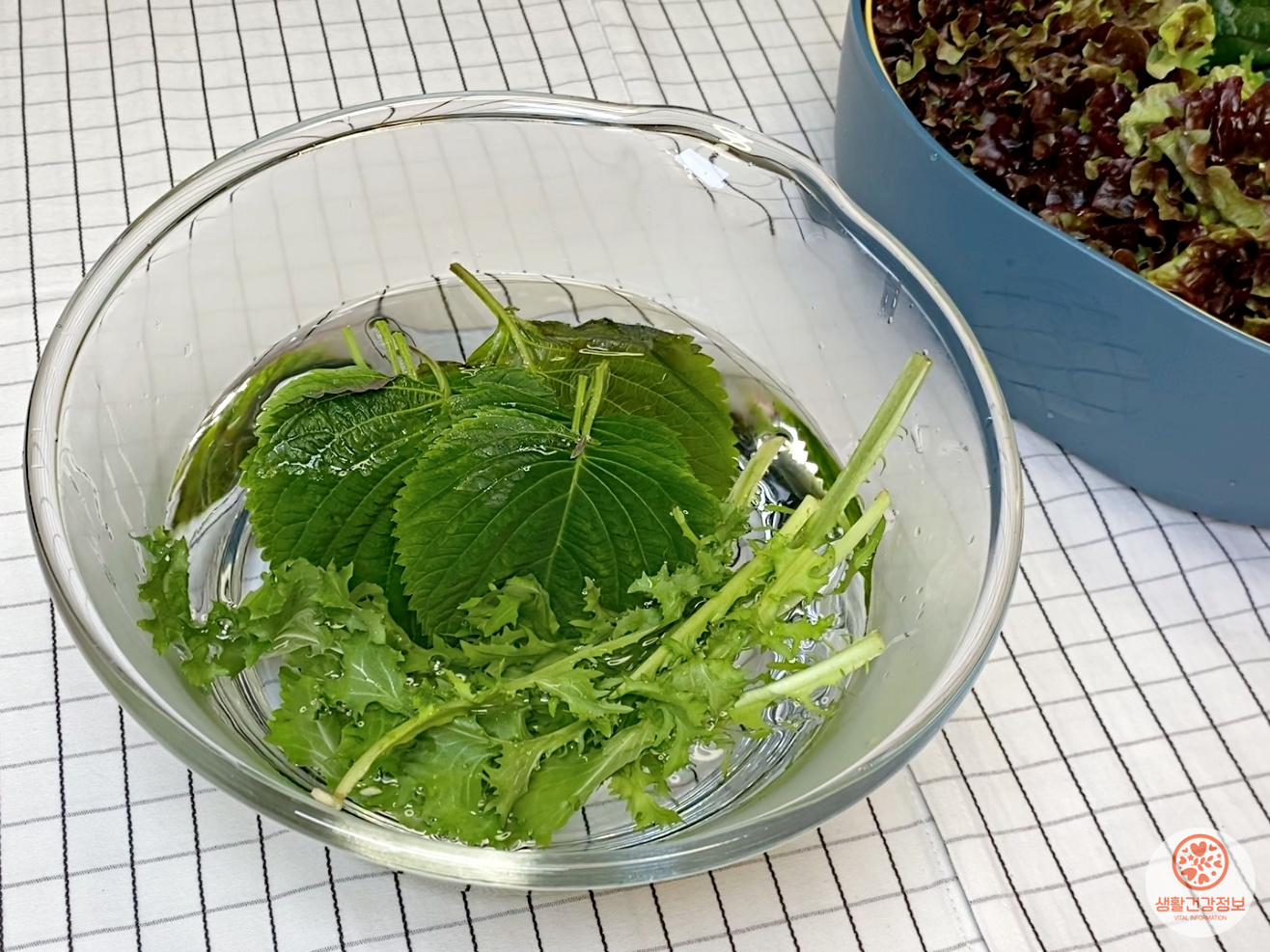 상추나 깻잎 등의 잎채소는 10분 안쪽으로 담가놓고요.