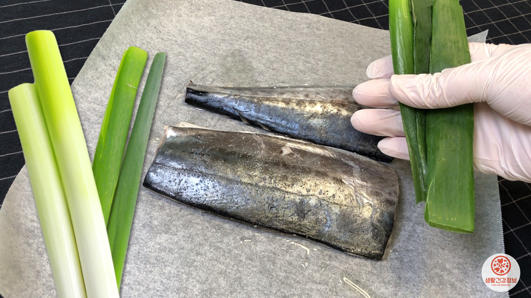 길쭉하게 손질한 대파를 생선 양옆으로 올려주세요.