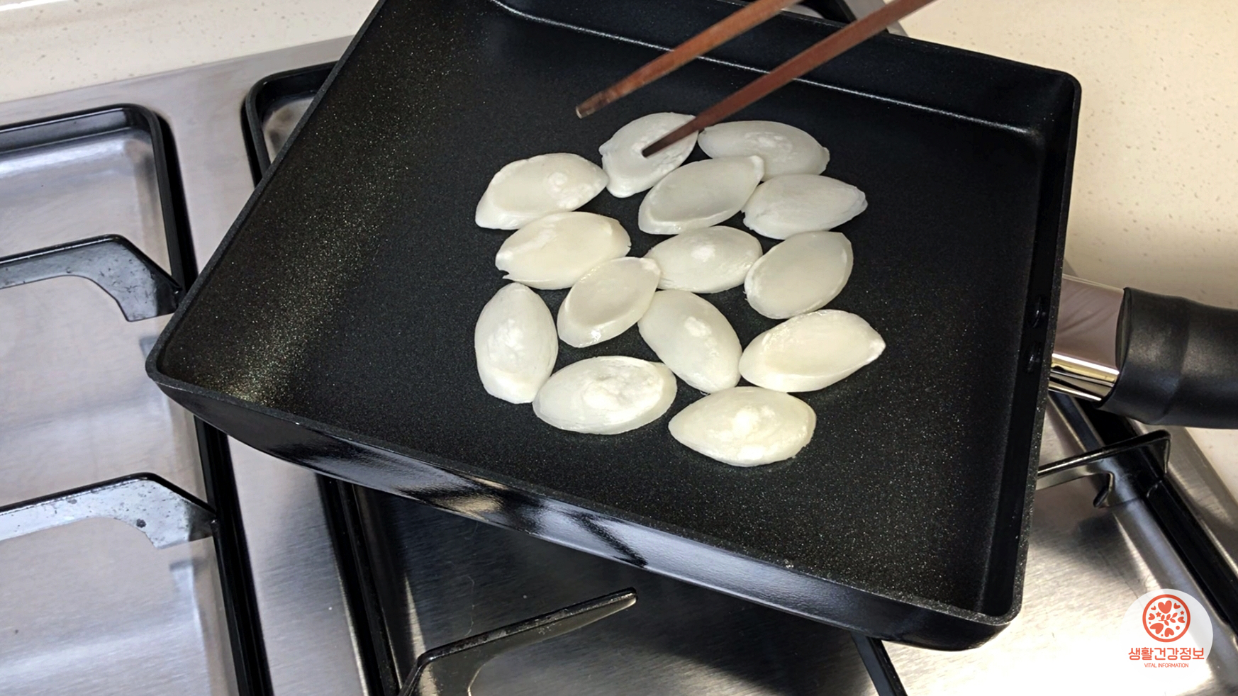 떡국떡을 올려서 앞뒤로 구워주세요.
