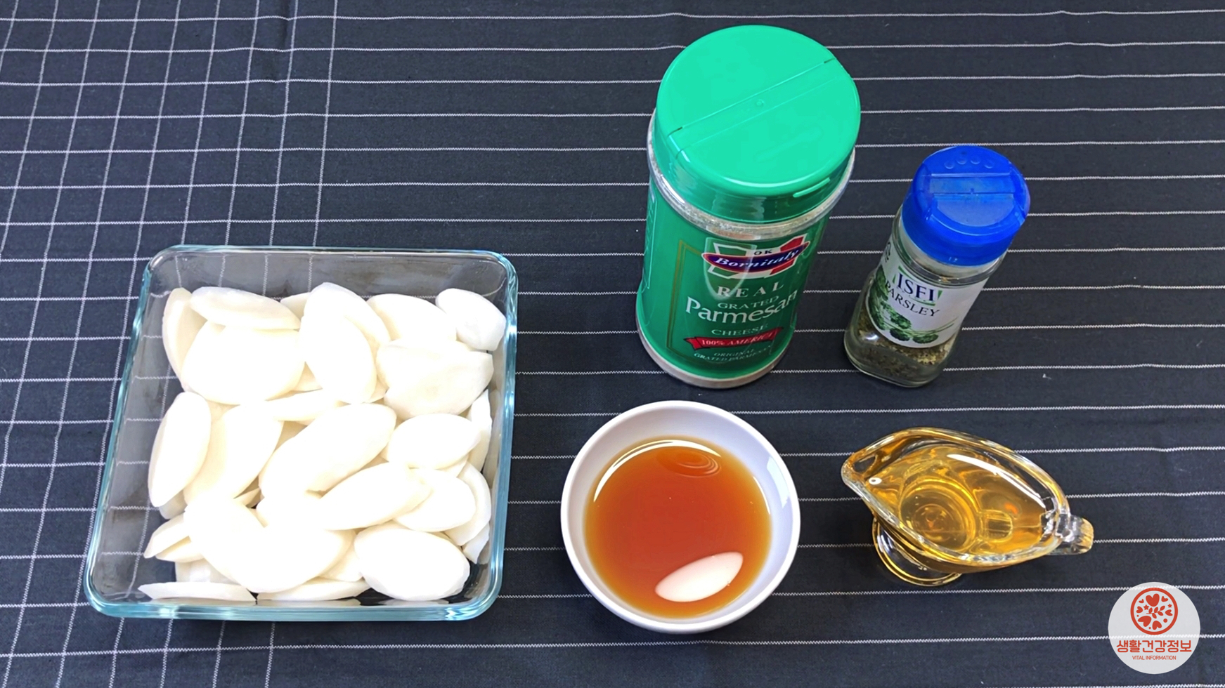 떡국떡, 참기름, 꿀, 파마신치즈가루, 파슬리가루.