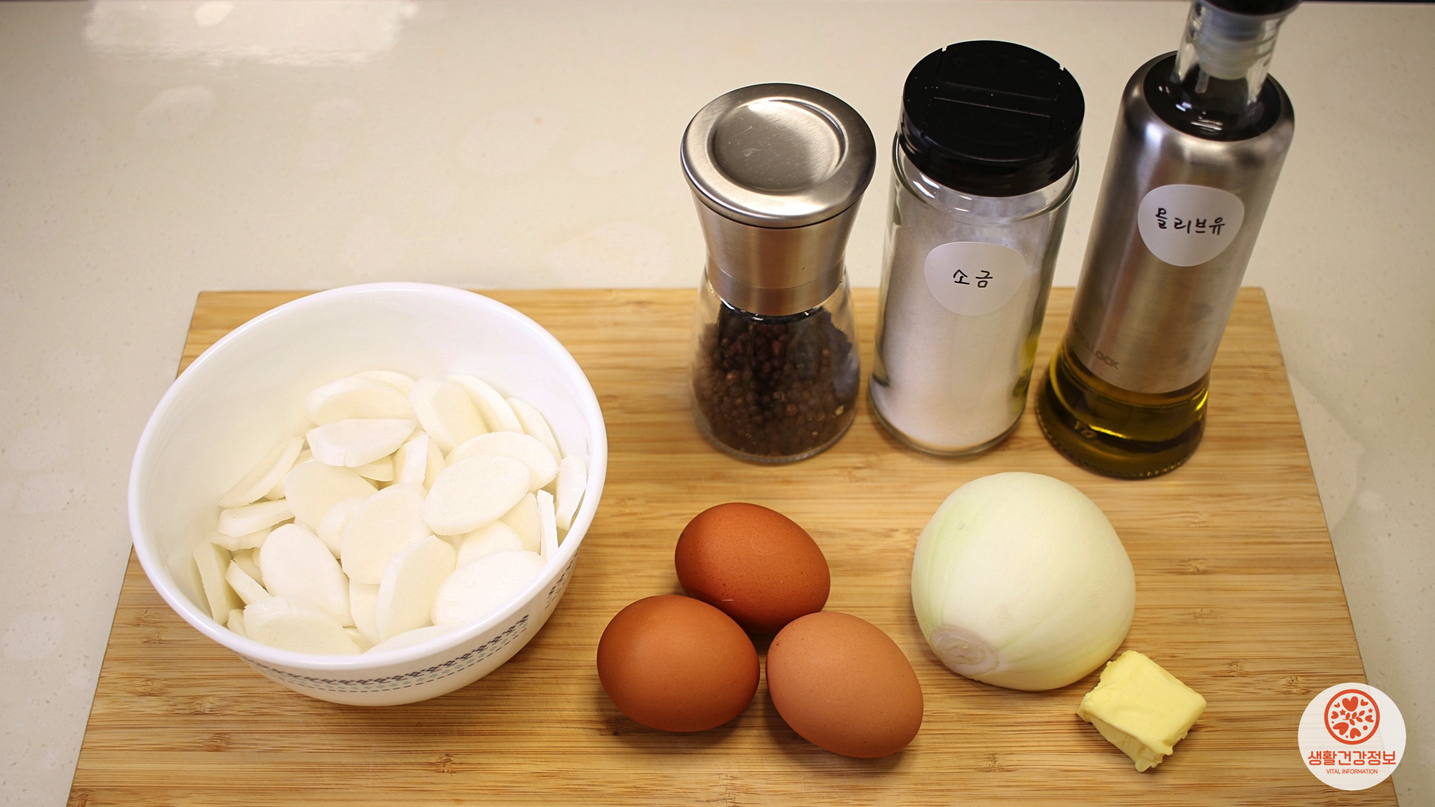 떡국떡, 달걀, 양파, 버터, 올리브오일, 소금, 후추